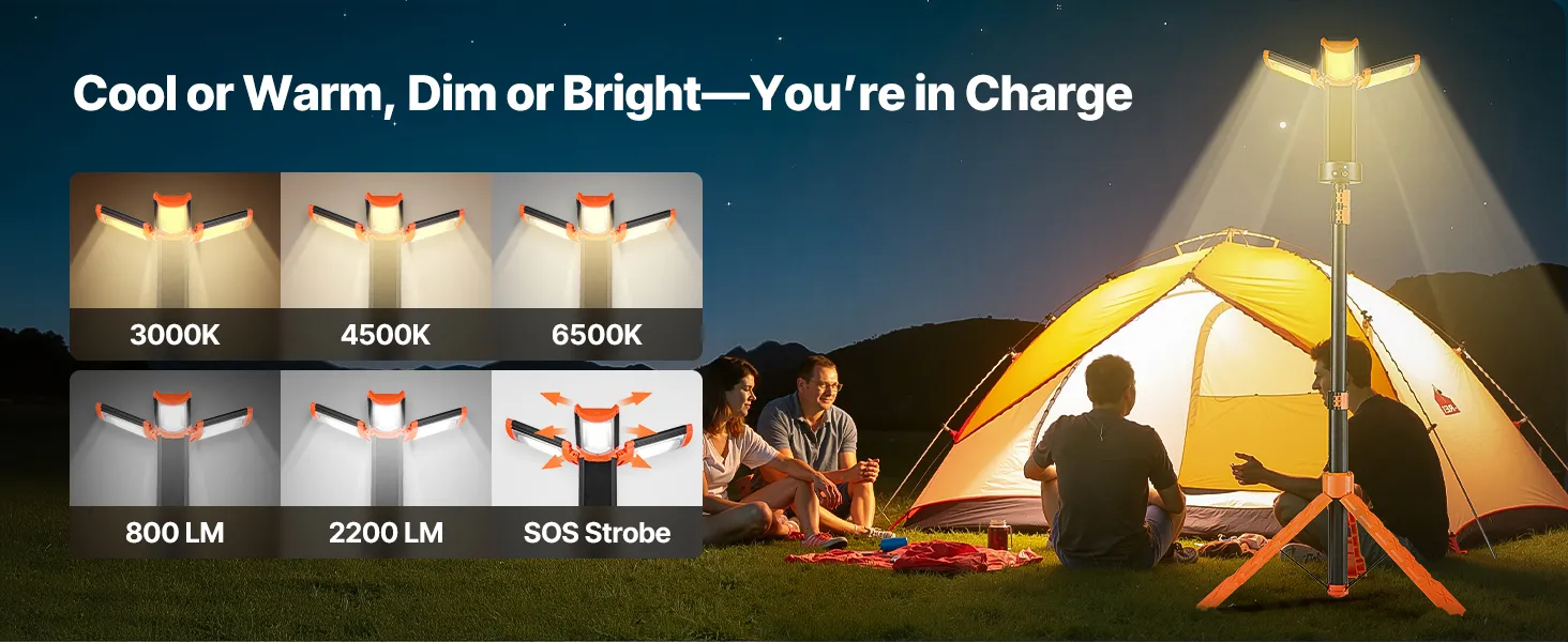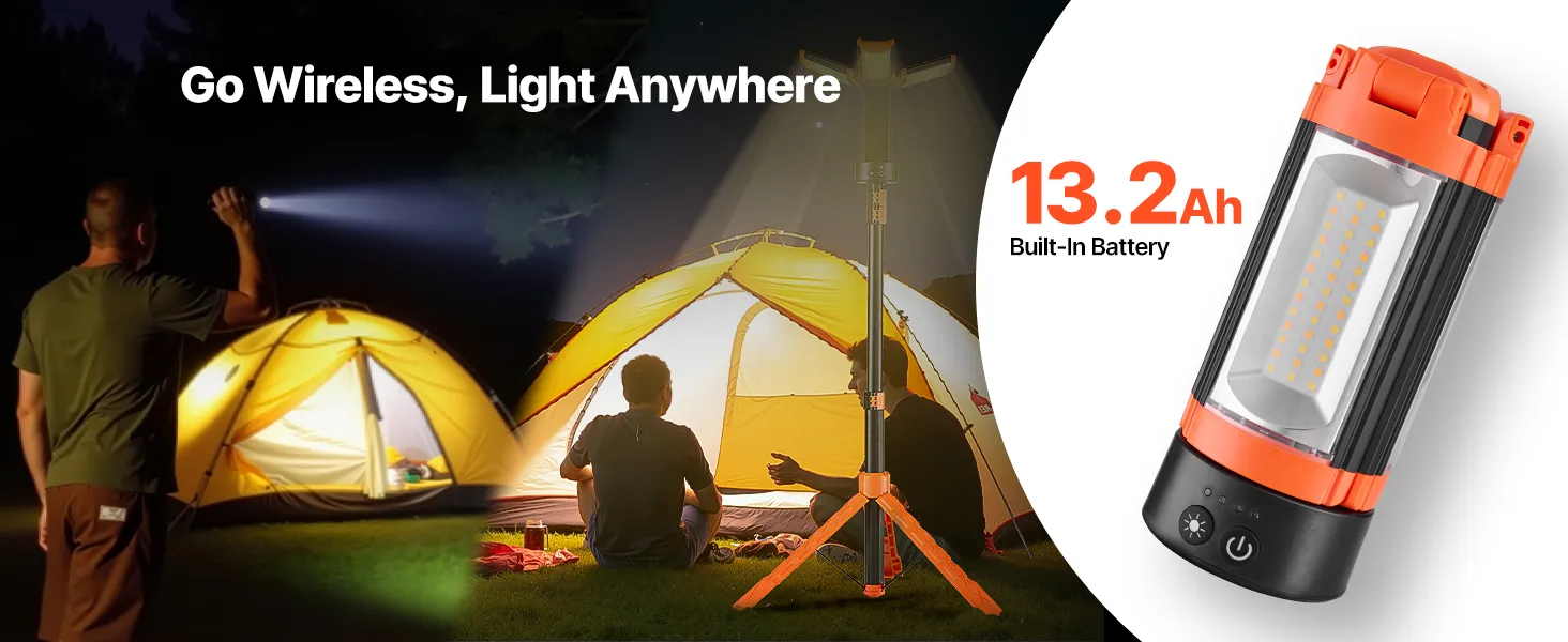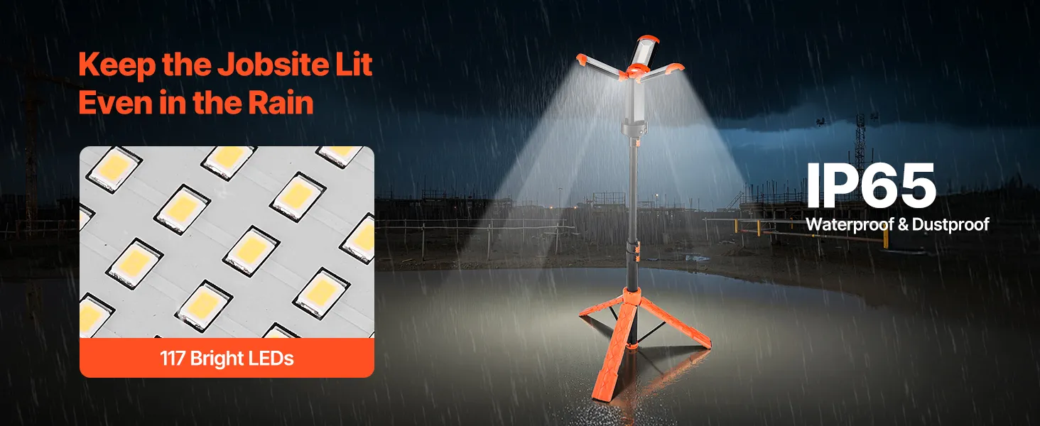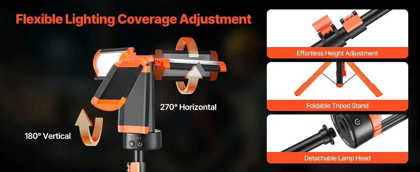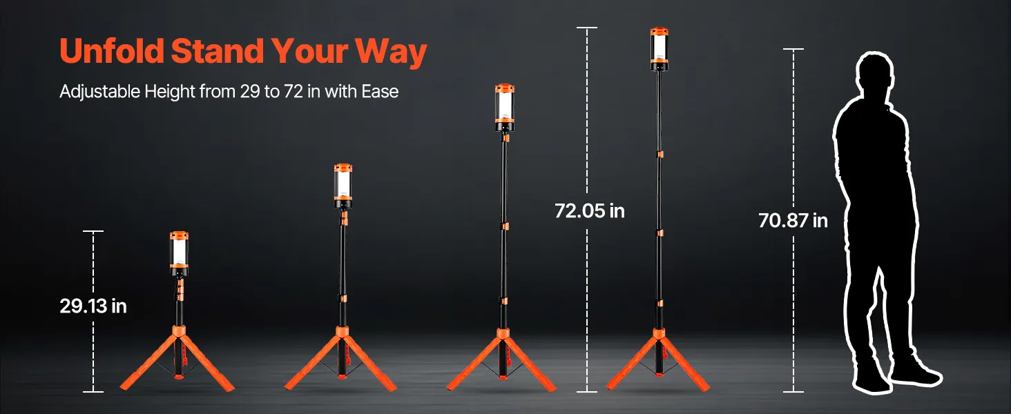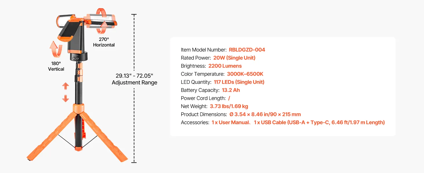 VEVOR LED darba gaisma ar statīvu, 13,2 Ah akumulators, uzlādējama bezvadu konstrukcijas un kempinga lampa ar 3 gaismas galvām, noņemamu trijkāja statīvu, spilgtums 2200 lūmeni, 3000–6500 K regulējama gaisma, pārnēsājama darba vietām
