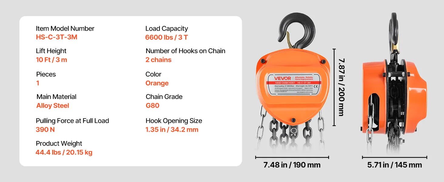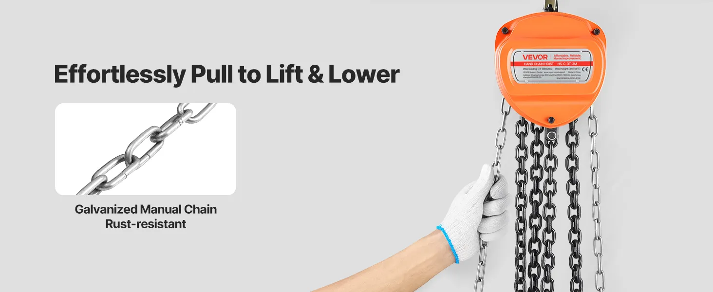 VEVOR manuālais ķēdes pacēlājs, 3 t, G80 cinkota ķēde, 3 m pacelšana, oranžs