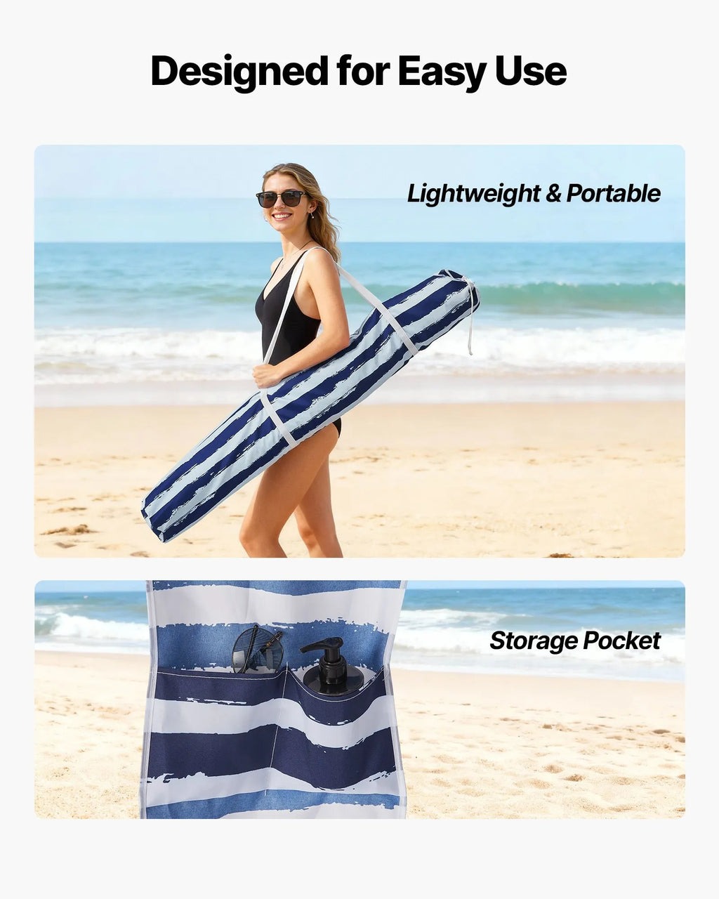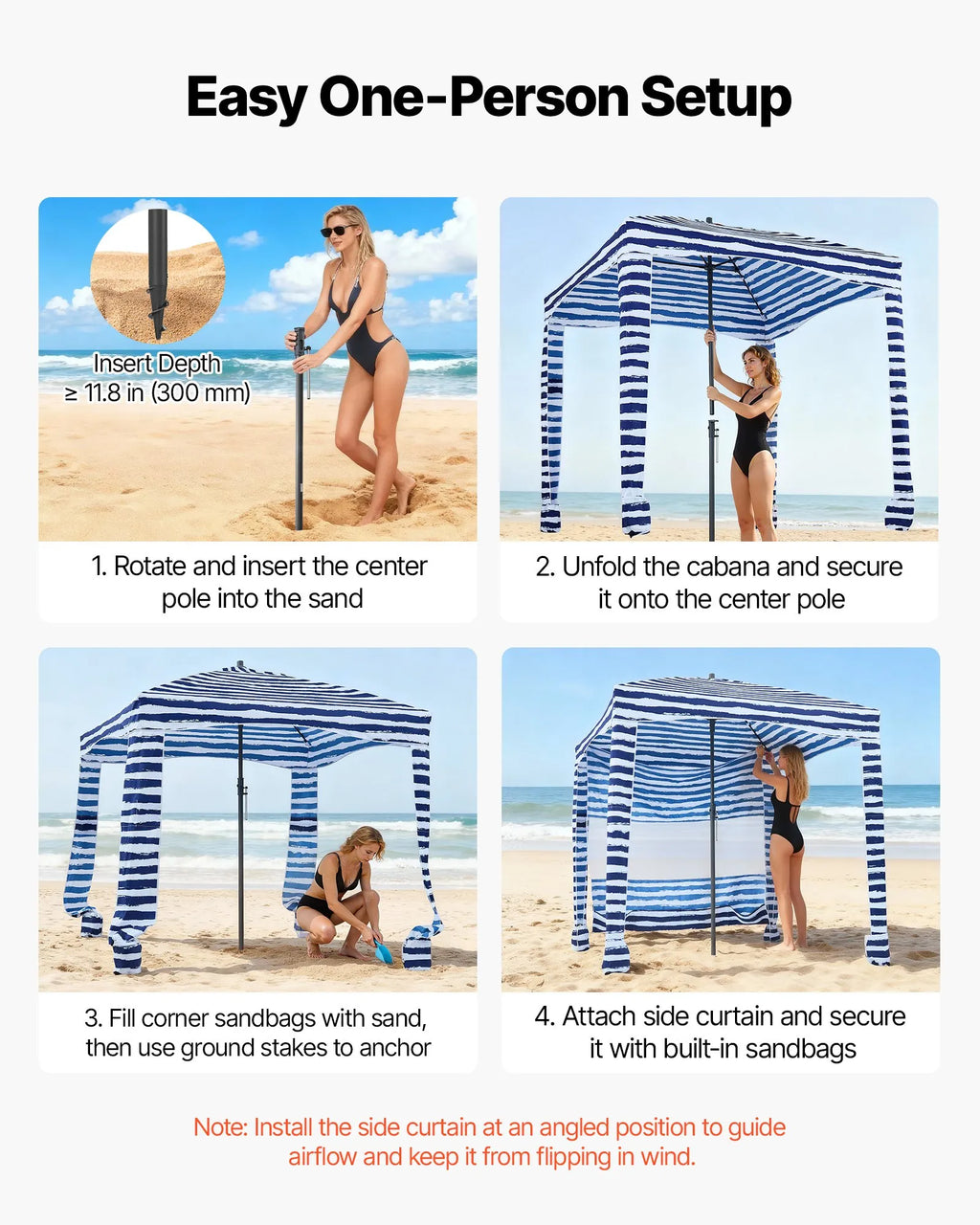 VEVOR pludmales kabāna, 1,83 × 1,83 m pludmales nojume ar sānu sienu, UPF 50+ aizsardzība, viegli uzstādamā kabānas telts ar smilšu kabatām, pārnēsājama saules aizsargu patversmes nojume visai ģimenei un draugiem, tumši zilu svītru dizainā.