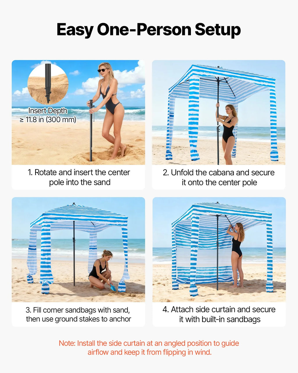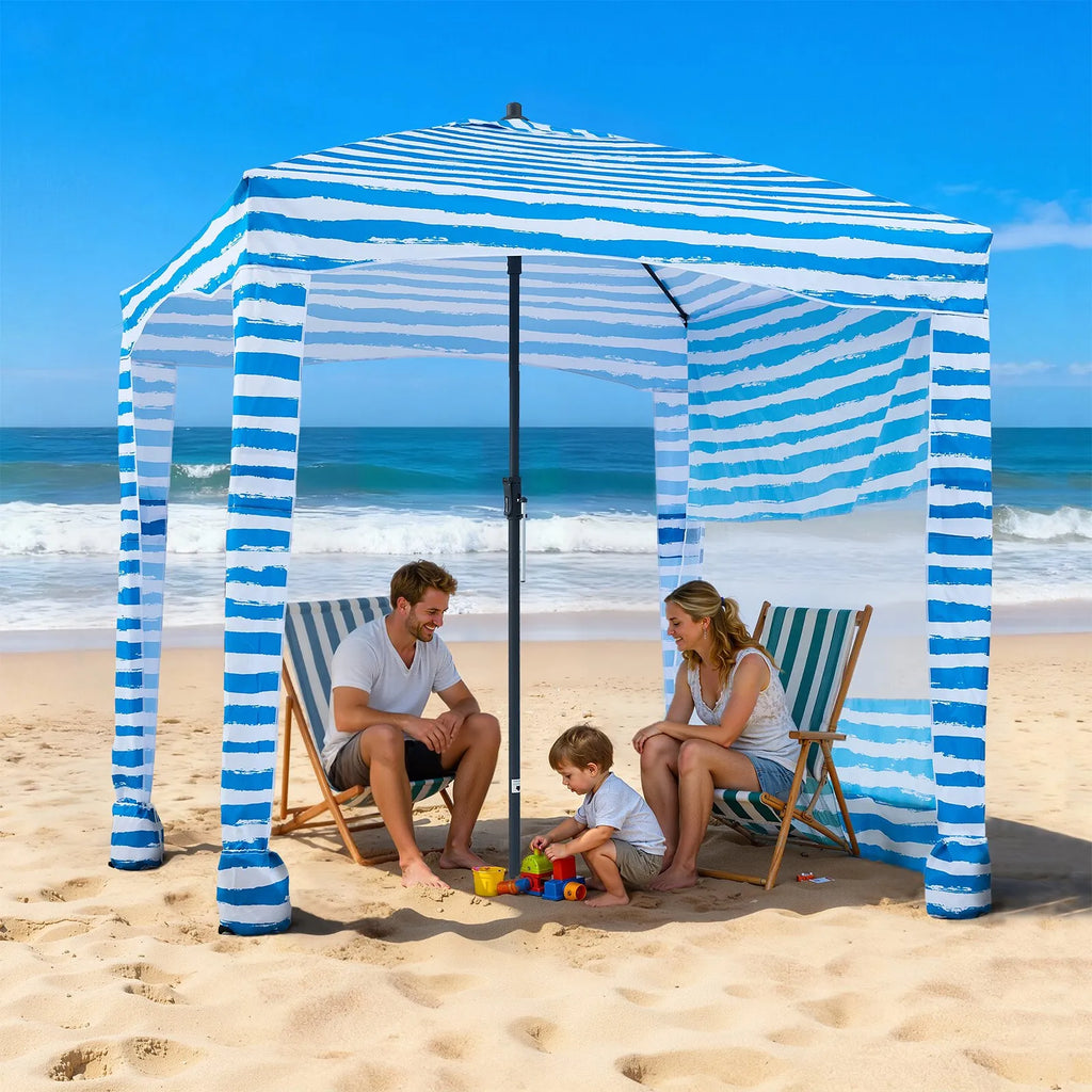 Šī pludmales kabāna nodrošina līdz UPF 50+ saules aizsardzību un ir aprīkota ar noņemamu sānu aizkaru. Piestipriniet to, lai iegūtu maksimālu ēnu, vai atvienojiet, lai baudītu atvērtu un labi vēdinātu telpu.