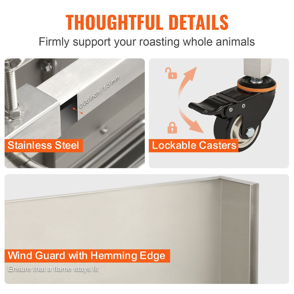 Dizains ar 4 dažādiem augstuma iestatījumiem ļauj viegli pielāgot hog roaster augstumu, lai kontrolētu gatavošanas temperatūru. Regulējams augstums: 19 cm - 43 cm.
