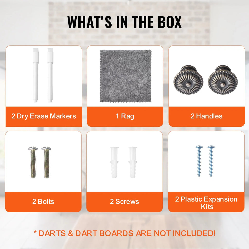 Komplektā iekļautie piederumi: Iekļauti 2 sausās tāfeles marķieri, 1 tīrīšanas lupatiņa, 2 rokturi, 2 skrūvju tapas, 2 skrūves un 2 plastmasas dībeļi. Piezīme: šautriņas un šautriņu dēlis nav iekļauti.