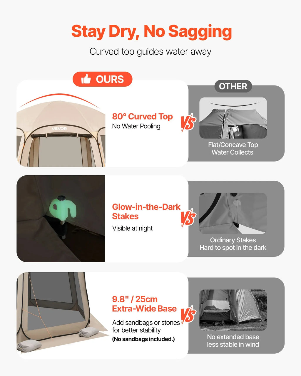 Plaša un ērta atpūtas telpa: Izbaudiet plašu āra telpu, kur ģimene un draugi var pulcēties un atpūsties. Šī sietveida telts ērti ietilpina līdz 12 personām bez saspiestības sajūtas, padarot to ideāli piemērotu atpūtai pagalmā, pludmalē vai mierīgiem kempinga izbraucieniem