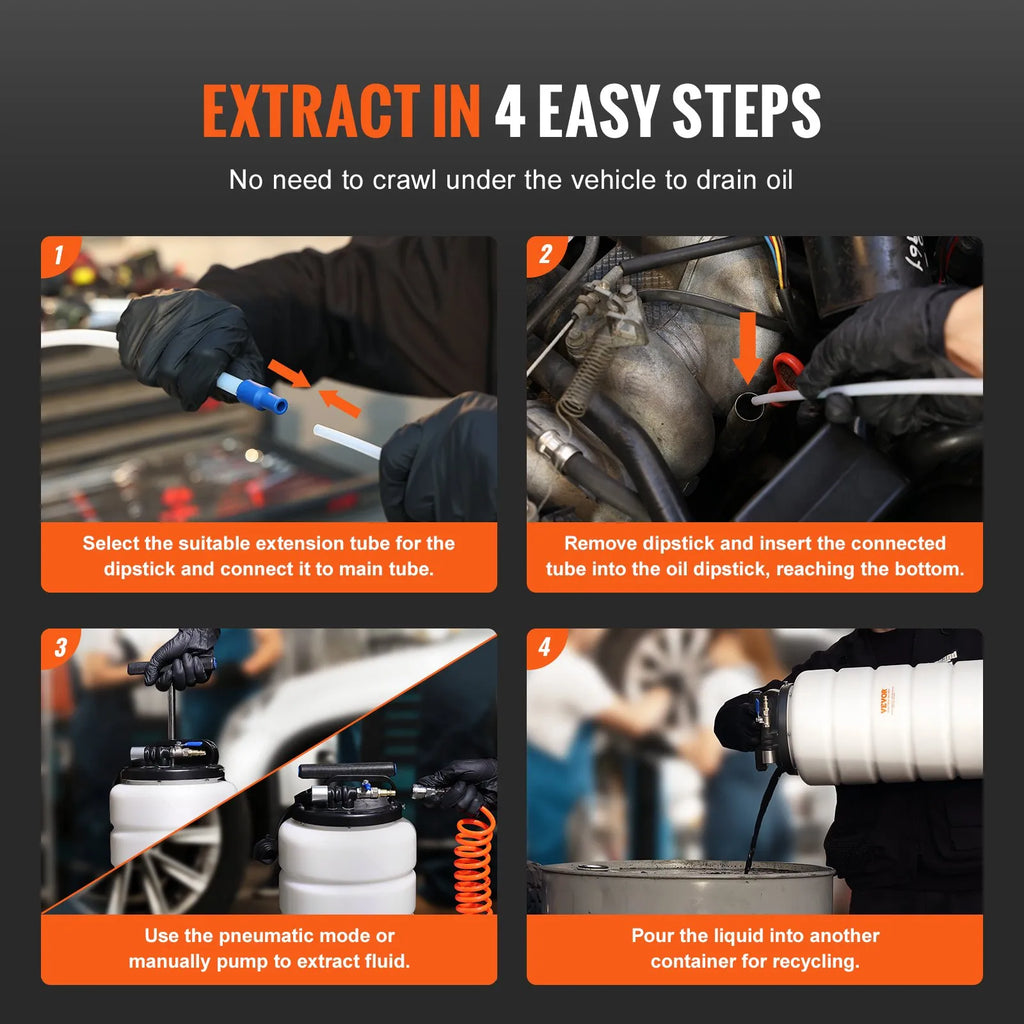VEVOR šķidruma ekstraktors atvieglo eļļas maiņu, ļaujot izsūknēt šķidrumu caur mērstieņa atveri bez nepieciešamības pacelt transportlīdzekli. Samazina netīrību un paātrina apkopes darbus.