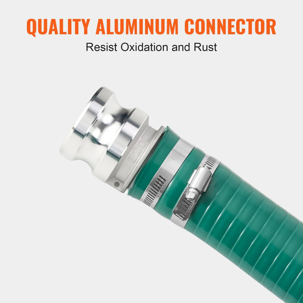 Sūkšanas šļūtenes komplekta alumīnija Camlock savienojumi ir uzticami un spēj izturēt augsta spiediena ūdeni bez plīšanas vai noplūdēm.