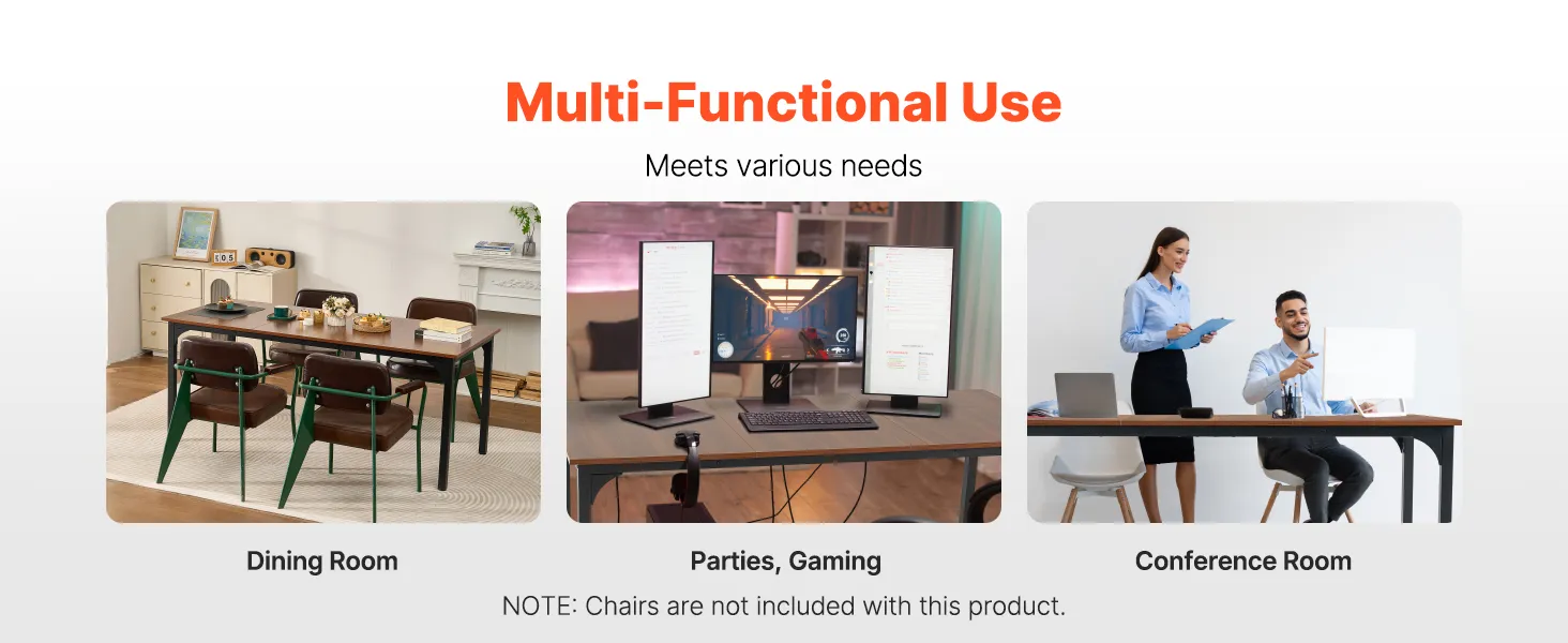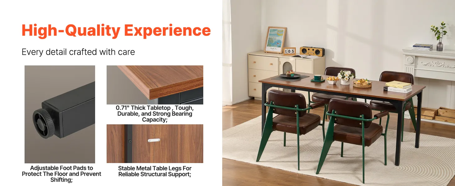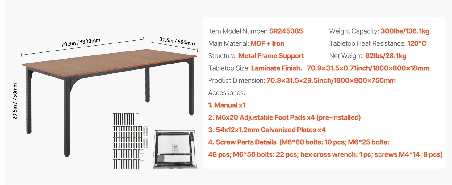 VEVOR taisnstūra ēdamgalds, 180 cm garš liels koka galds 6–8 personām, lauku stila ēdamistabas mēbele ar metāla kājām, piemērots virtuvei, viesistabai vai birojam, brūns (tikai galds)