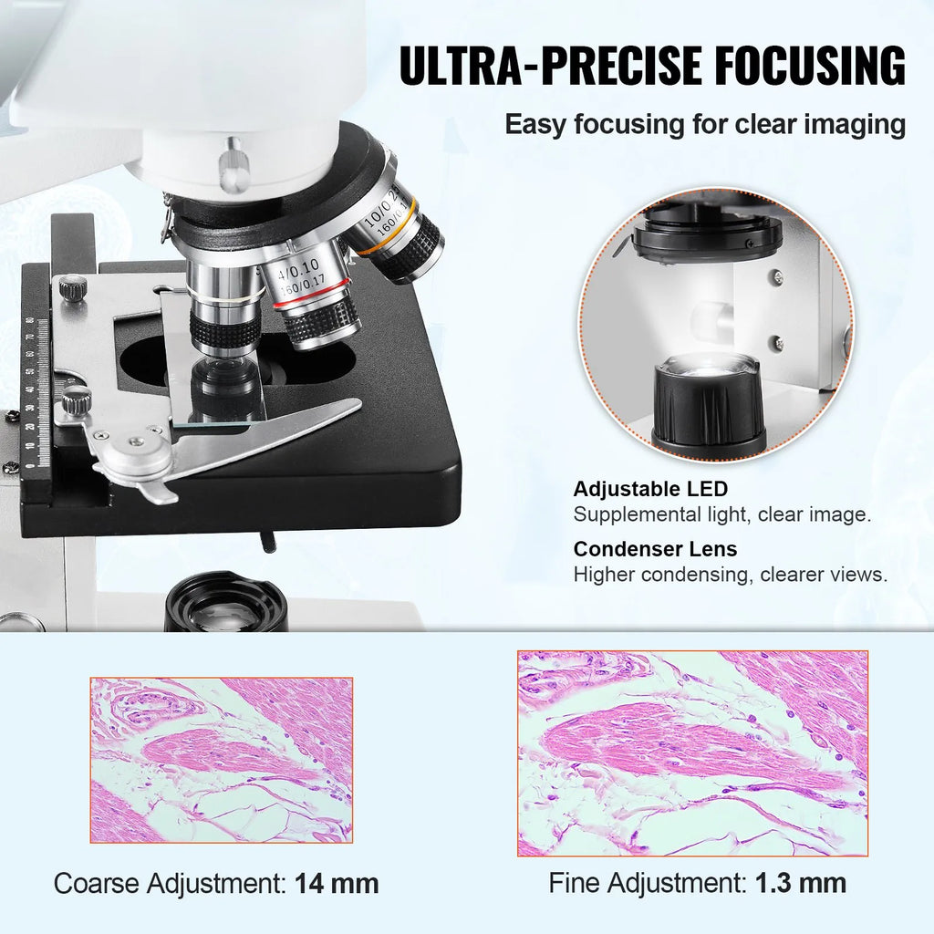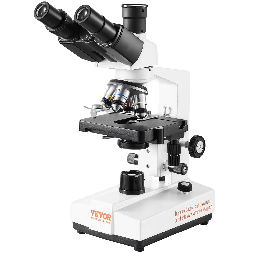 VEVOR trīnokulārais laboratorijas mikroskops ar LED apgaismojumu un ārējo interfeisu, palielinājums 40–2500×