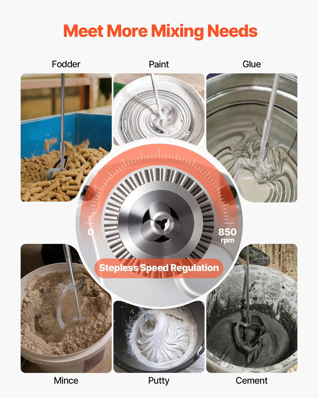 Maināms ātruma regulators: Aprīkots ar bezpakāpju ātruma kontroli, šis maisīšanas instruments ļauj precīzi regulēt apgriezienus no zemiem līdz augstiem. Tas pielāgojas gan šķidriem, gan biezākiem materiāliem, nodrošinot vienmērīgu un stabilu darbību.