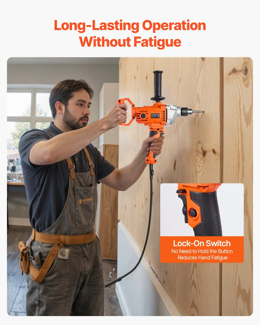 Lietotājam draudzīgas detaļas: VEVOR rokas cementa maisītājam ir rotējošs aizmugurējais rokturis, pretvibrācijas gumijas satvēriens un fiksācijas poga nepārtrauktai darbībai. Īpaši garais 5 m strāvas kabelis nodrošina lielāku kustību brīvību darba zonā.