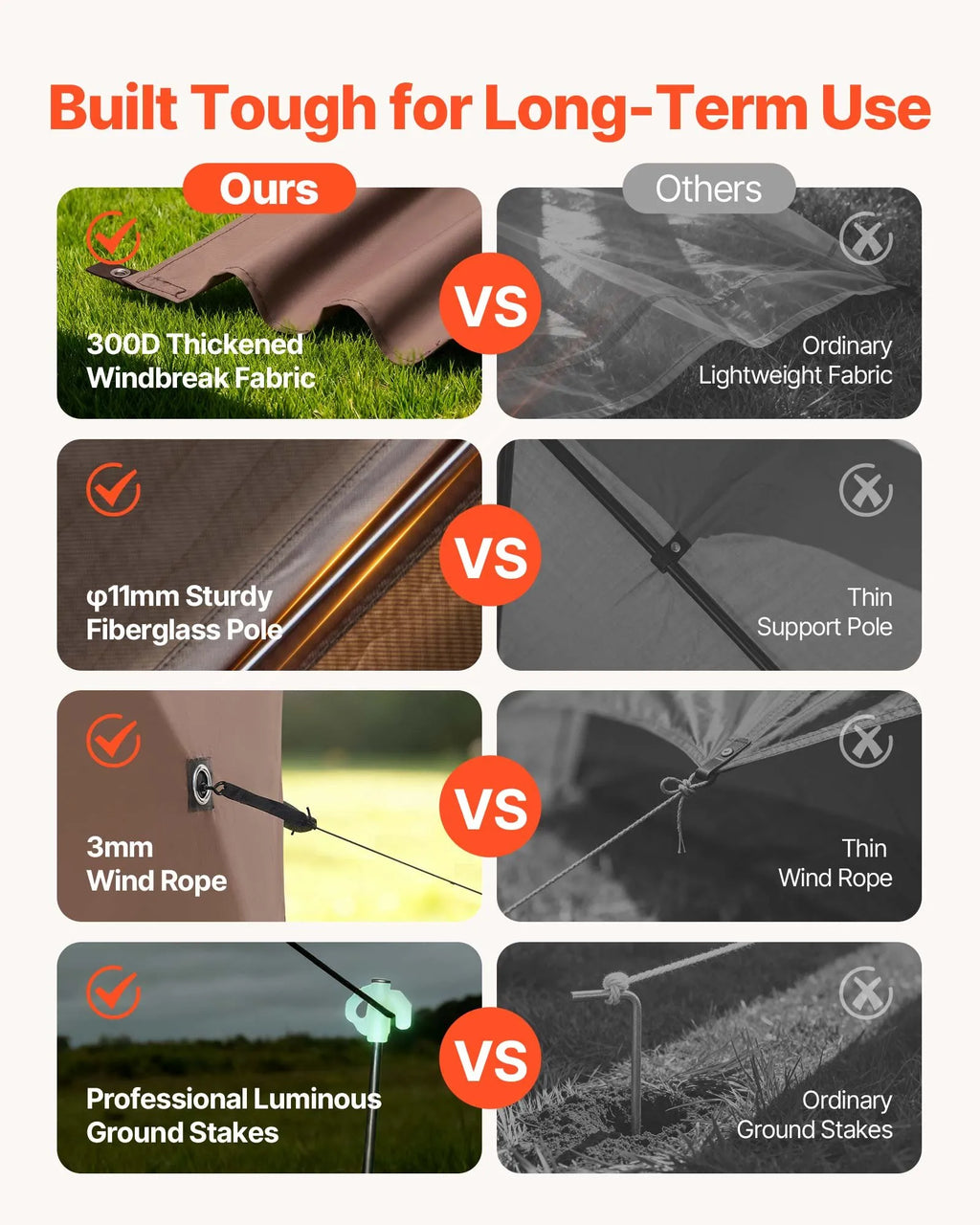 Vēja izturīga konstrukcija: Augstas izturības stiklašķiedras stabi un seši pastiprināti uzrullējami vēja paneļi uzlabo stabilitāti un privātumu. Sānu lipekļa aizdares novērš paneļu plīvošanu vējā. Uznirstošā nojume ietver vairākus zemes mietiņus un vēja troses drošai uzstādīšanai ārā. (Ieteikums: drošības nolūkos spēcīga lietus vai vētras laikā nojumi demontēt.)