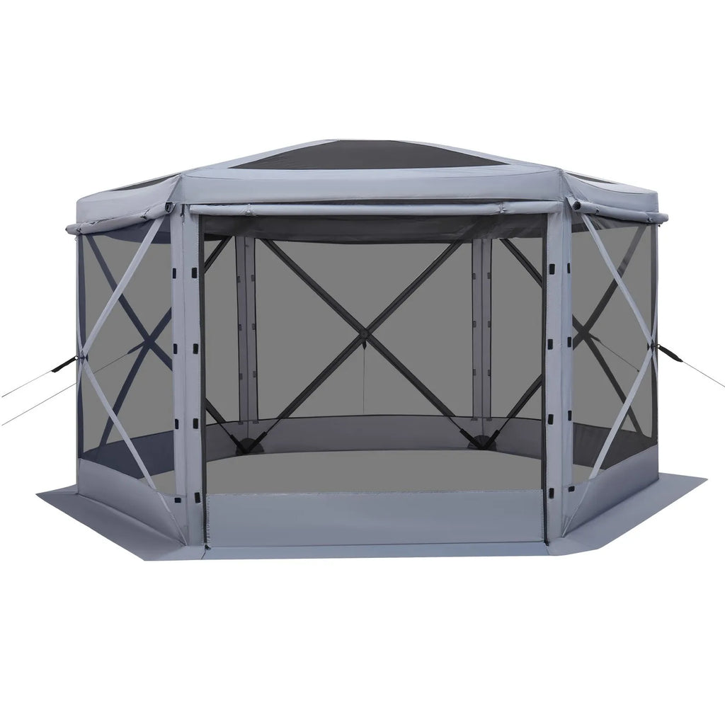 Plaša telpa 10 personām: Šī 3,6 × 3,6 m uznirstošā lapenes sieta telts ērti ietilpina 6 sēdošas personas ar mēbelēm un līdz 8–10 personām dažādām aktivitātēm. 2,19 m augstais jumts nodrošina ērtu pārvietošanos iekšpusē. Rāvējslēdzēja un piesienamie durvju paneļi ļauj ērti ieiet un iziet. Ideāli piemērota ģimenes saietiem, ballītēm un kempingam