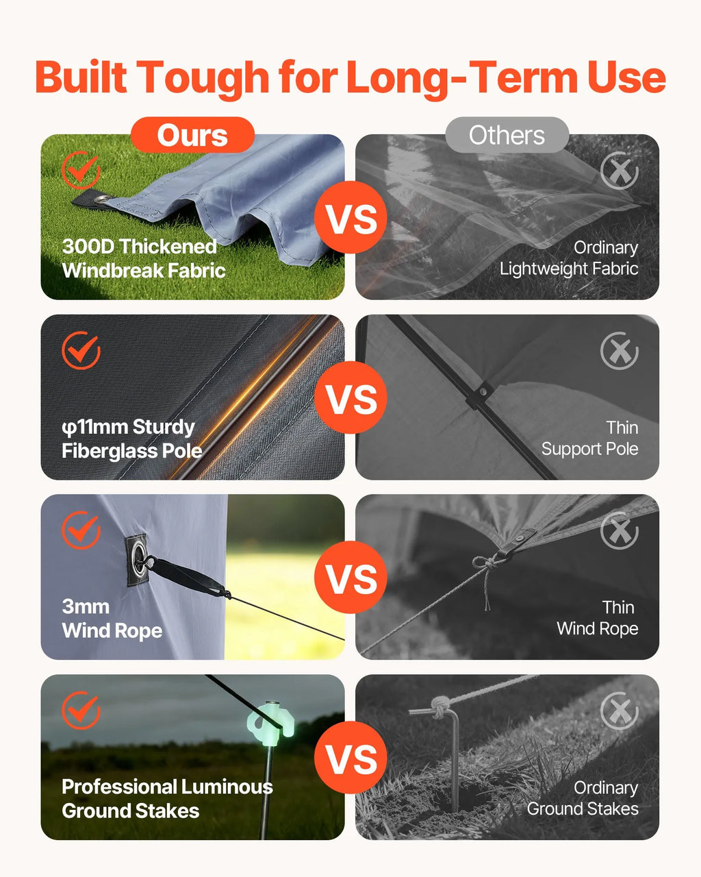 Vēja izturīga konstrukcija: Augstas izturības stiklašķiedras stabi un seši pastiprināti uzrullējami vēja paneļi uzlabo stabilitāti un privātumu. Sānu lipekļa aizdares novērš paneļu plīvošanu vējā. Uznirstošā nojume ietver vairākus zemes mietiņus un vēja troses drošai uzstādīšanai ārā. (Ieteikums: drošības nolūkos spēcīga lietus vai vētras laikā nojumi demontēt.)
