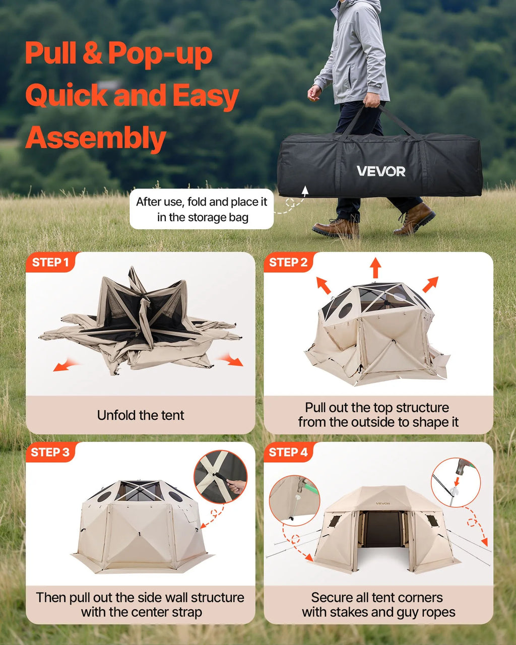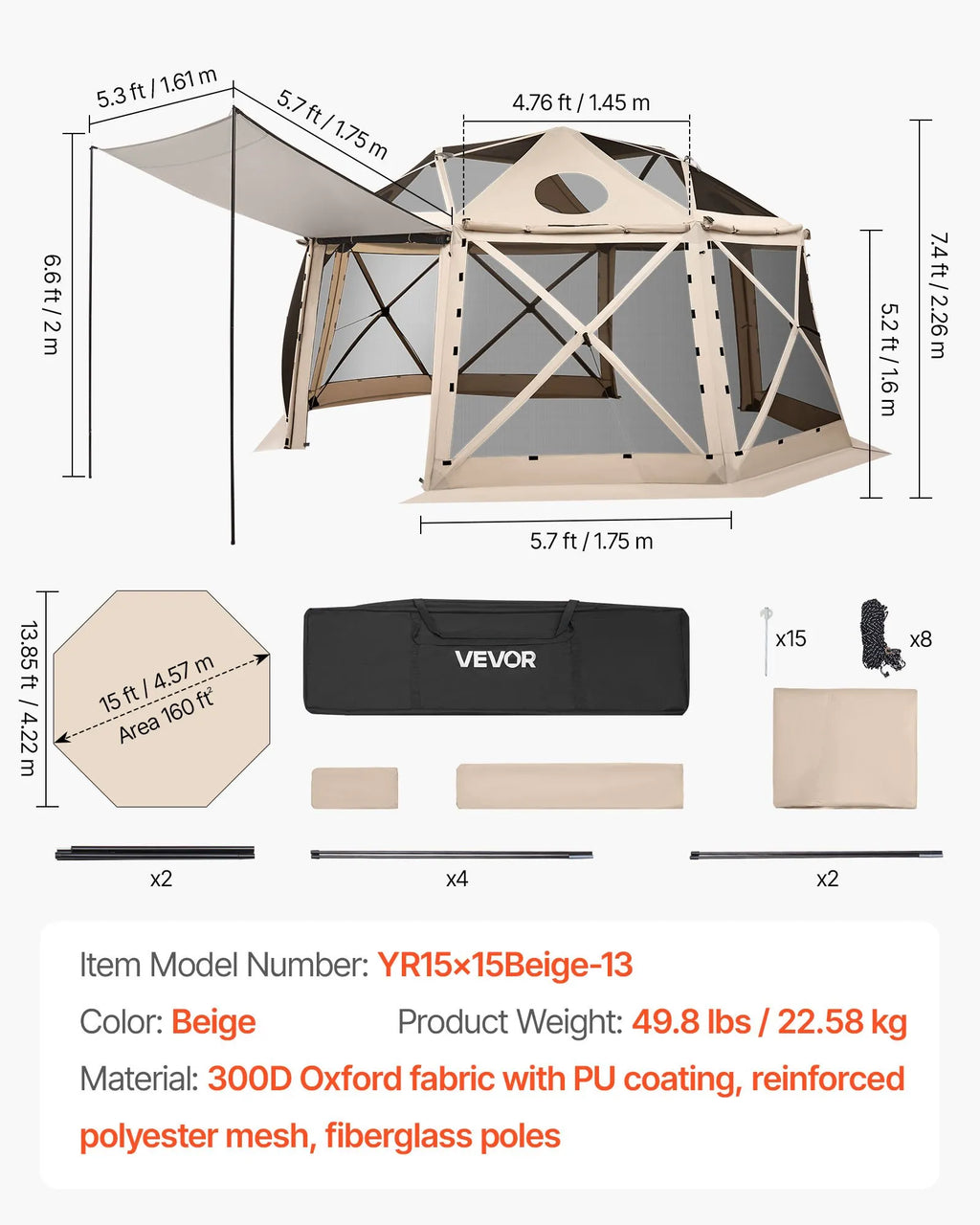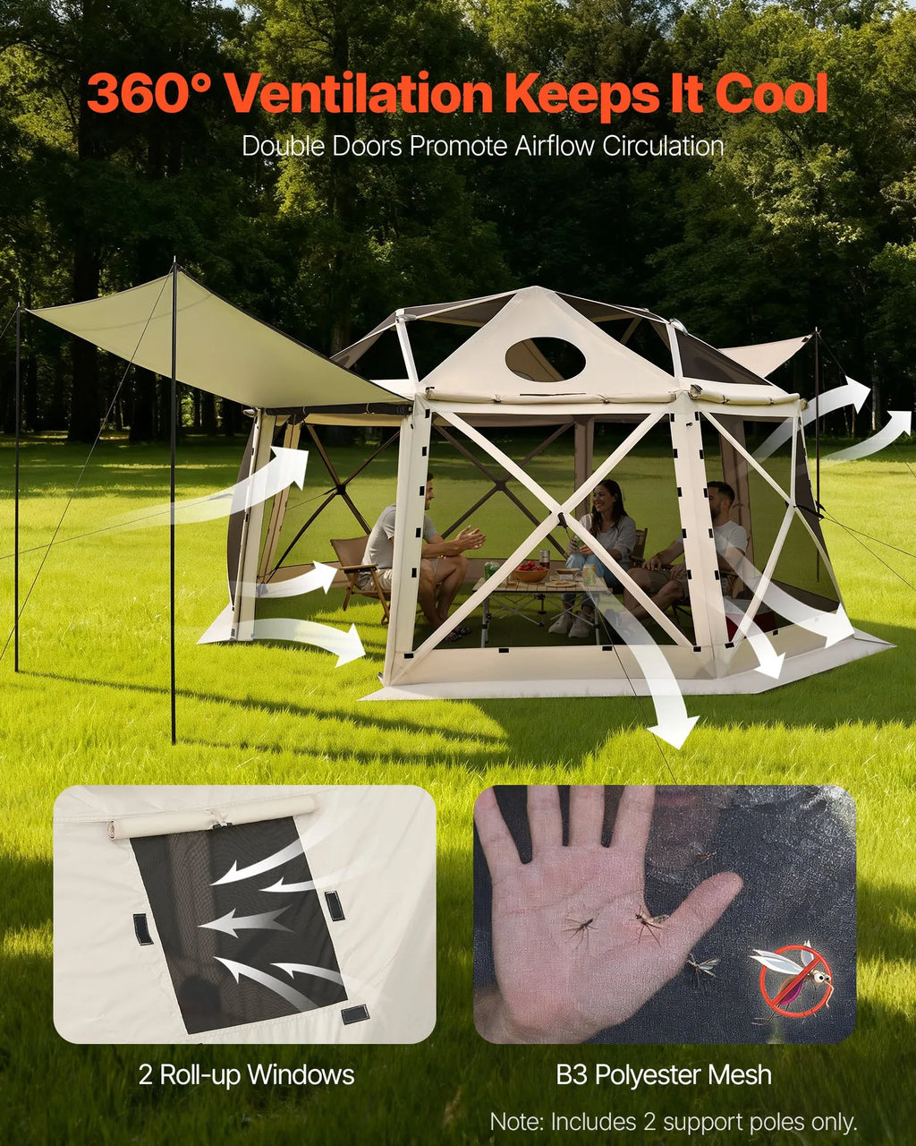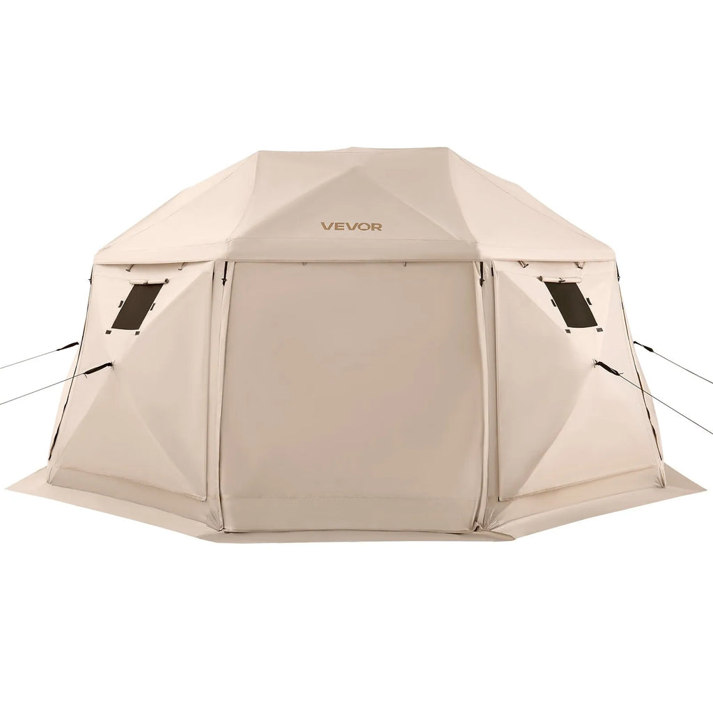 VEVOR uznirstoša sietveida lapene-telts, 4,57 × 4,57 m, 13-sānu sfēriska kempinga nojume ar noņemamu jumtu un pārnēsāšanas somu, ātra uzstādīšana, aizsardzība pret kukaiņiem, saules patversme 12–15 personām, bēša