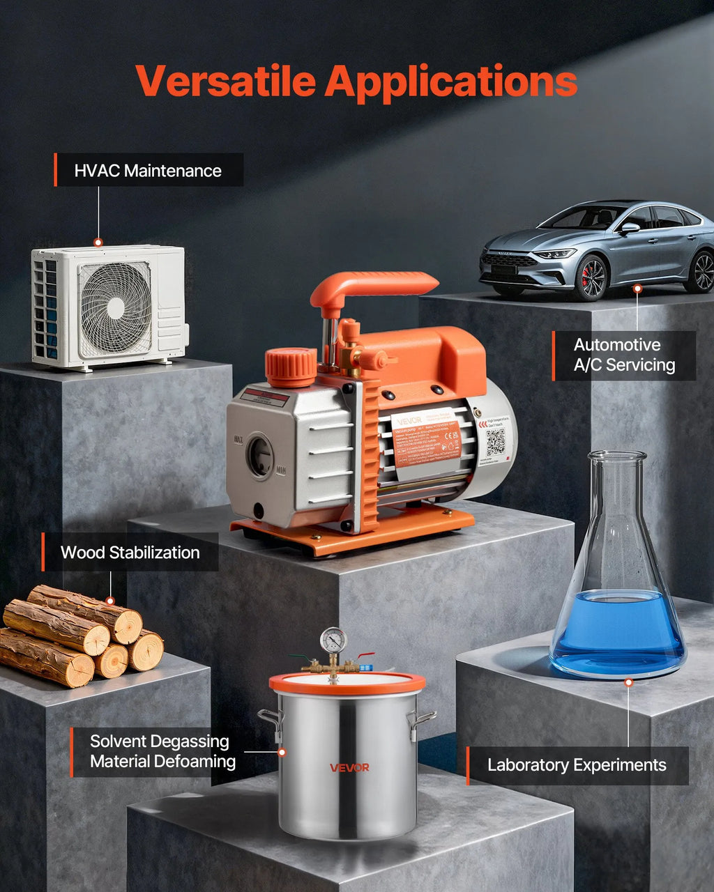 Daudzpusīgs pielietojums: Šis automobiļiem paredzētais gaisa kondicionēšanas vakuumsūknis ir piemērots dzesēšanas sistēmu apkopei, HVAC remontam, sveķu degazēšanai un koksnes stabilizācijai. Piemērots gan profesionālai, gan mājas lietošanai dažādās nozarēs un radošos projektos.