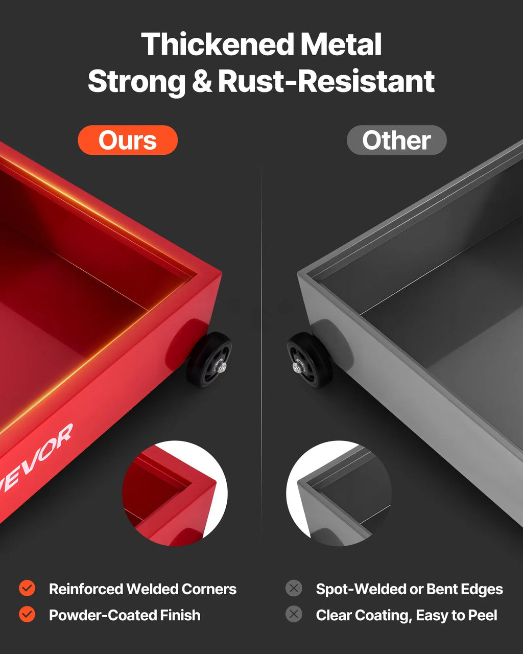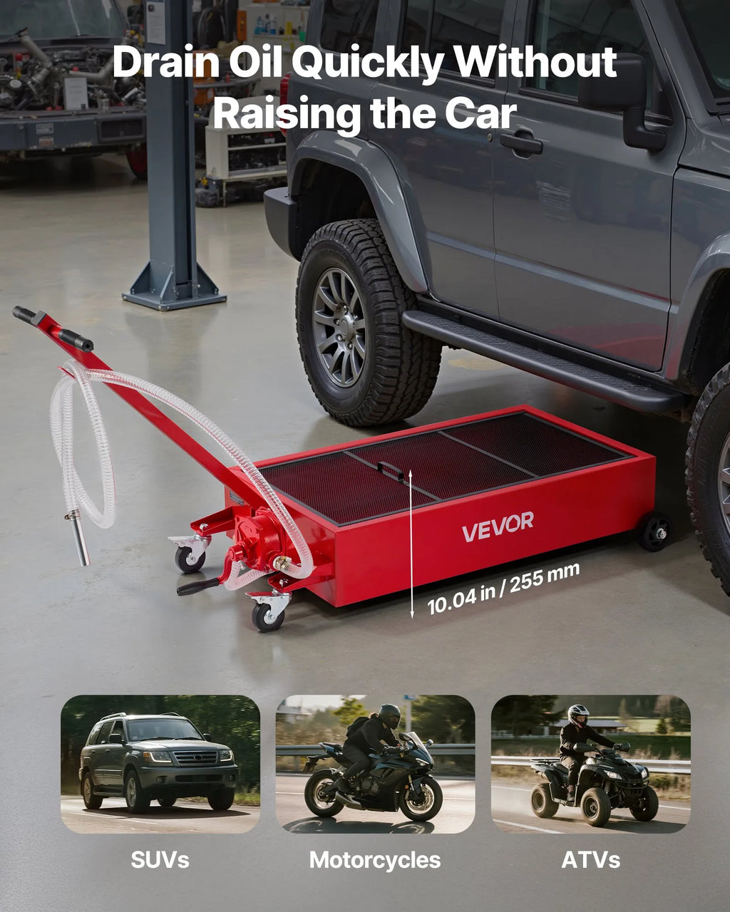 VEVOR zema profila eļļas savākšanas panna 75,7 l ar riteņiem un manuālo sūkni, 2,2 m šļūtene un T veida salokāms rokturis, hermētiska un korozijizturīga, piemērota vieglajām automašīnām, SUV, kravas auto un ATV, sarkana