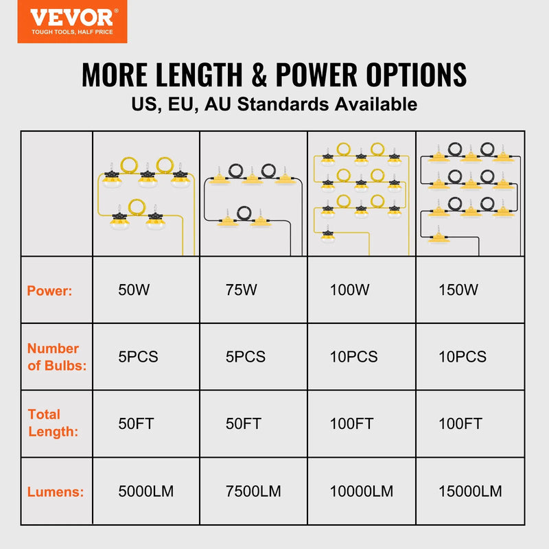 Līdz pat 10000 lm: VEVOR būvniecības apgaismojuma virtene ar 100 W jaudu un 30,5 m kopējo garumu nodrošina plašu iekštelpu un āra apgaismojuma risinājumu nakts laikā. 5000K dienasgaismas krāsu temperatūra precīzi ataino apgaismoto objektu dabisko krāsu.