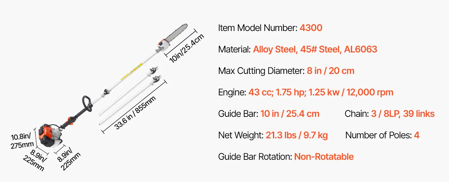 Šis benzīna teleskopiskais zāģis ir paredzēts āra zaru apgriešanai un ainavu kopšanai. Tas aprīkots ar augstas veiktspējas 2-taktu benzīna motoru, kas nodrošina jaudīgu darbību un vieglu iedarbināšanu. 25,4 cm motorzāģa ķēde nodrošina vienmērīgu griešanu, savukārt bezvadu konstrukcija ļauj ērti aizsniegt augstus zarus.