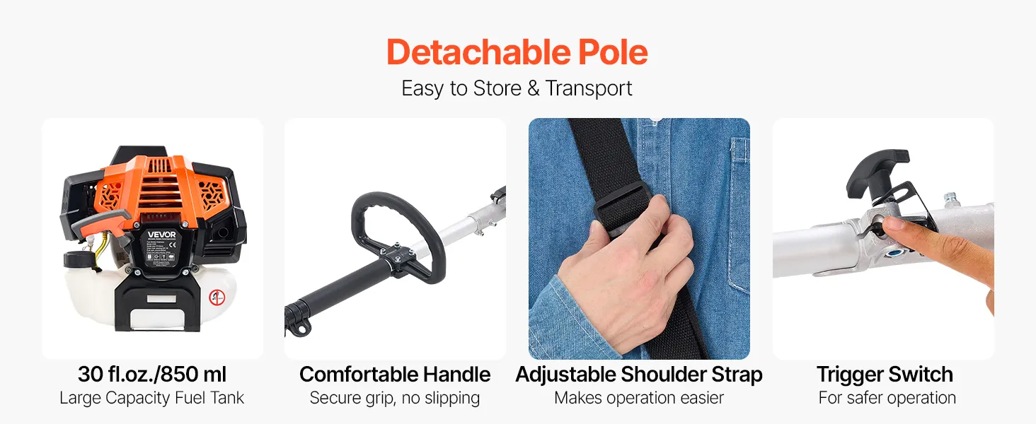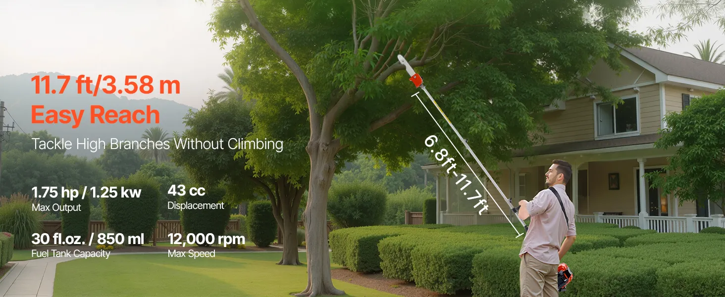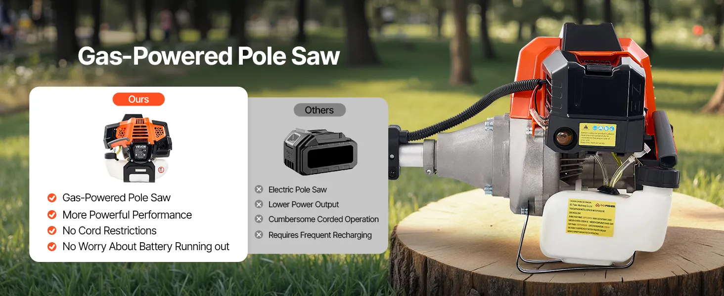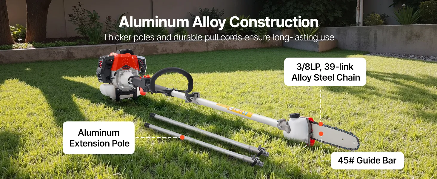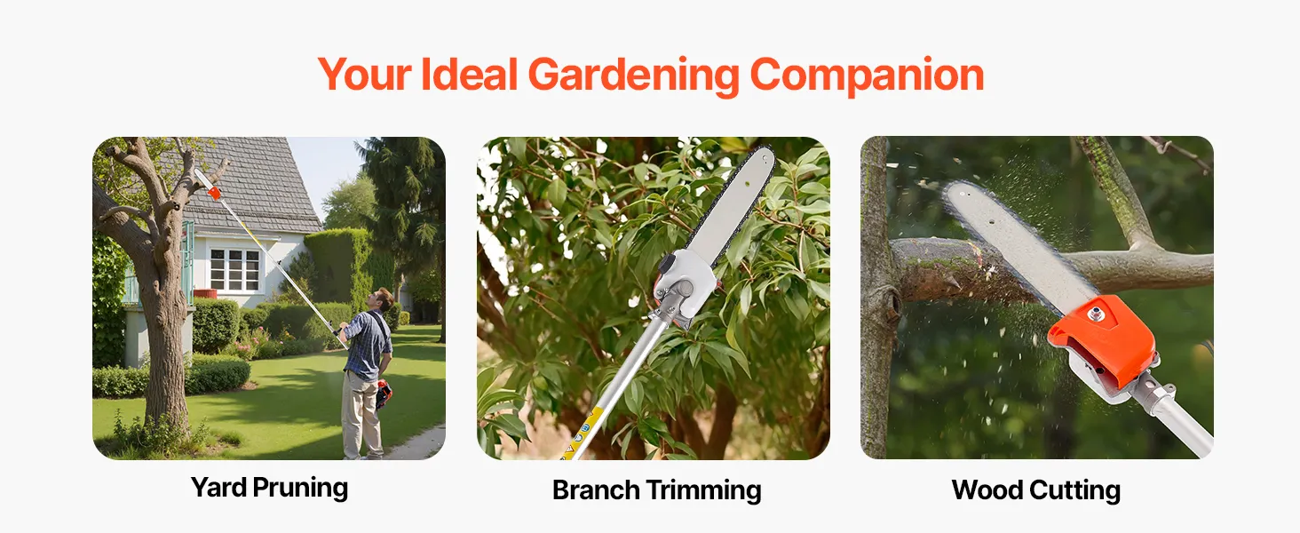 Plašs pielietojums: 2-taktu motorzāģis ar teleskopisko kātu ir ideāli piemērots augļu koku apgriešanai, saimniecības teritoriju tīrīšanai, ainavu kopšanai un neatliekamajiem darbiem. Bezvadu konstrukcija nodrošina brīvu pārvietošanos un darbu bez elektrības pieslēguma ierobežojumiem.