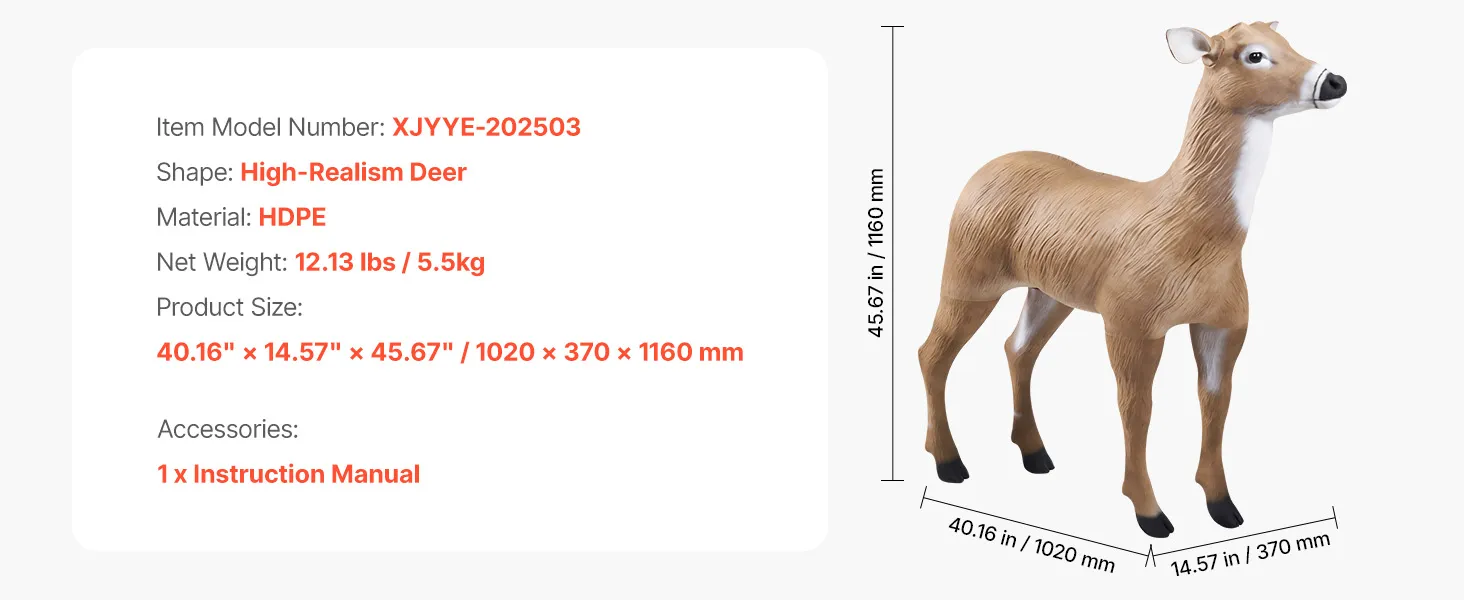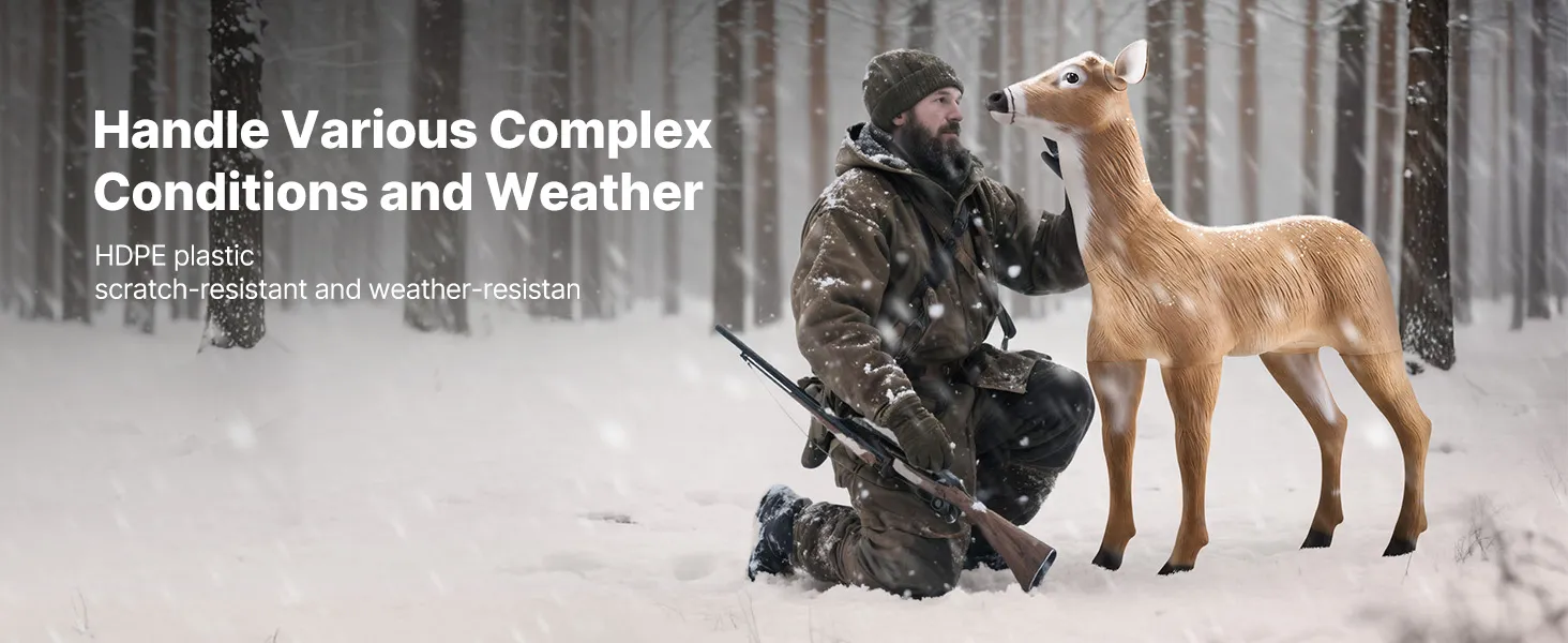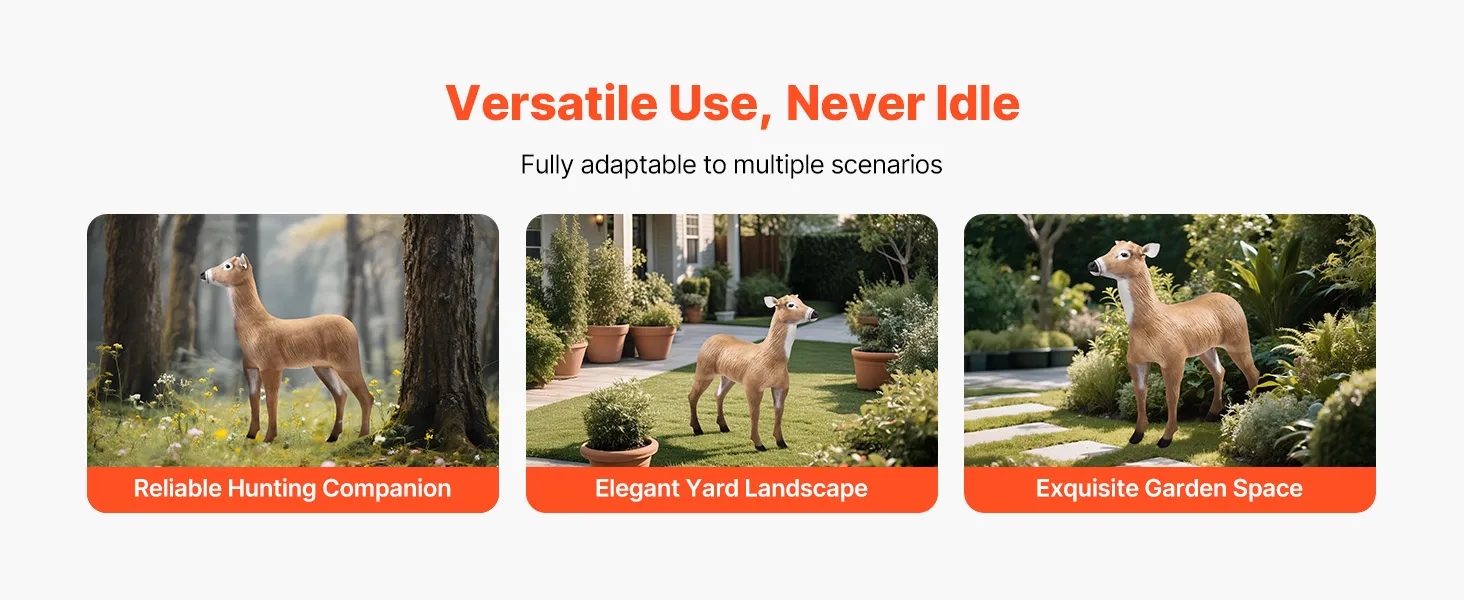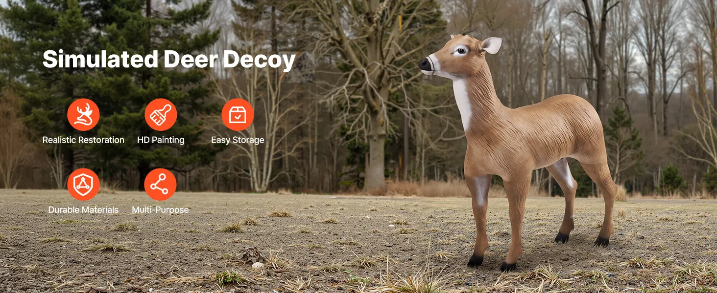 Reālistisks izskats: Izmantojot augstas izšķirtspējas krāsošanas tehnoloģiju, brieža māneklis precīzi ataino briedes kažoka krāsu, tekstūru un pozu. No attāluma tas izskatās gandrīz kā īsta brieža mātīte, aktivizējot tēviņu instinktīvo uzvedību.
