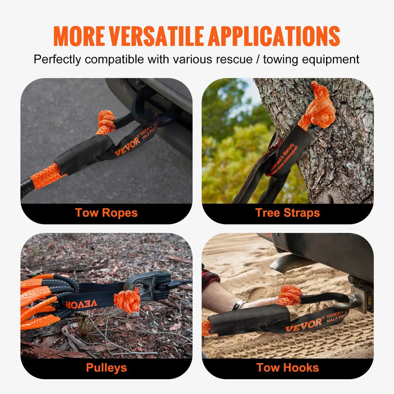 VEVOR mīkstā šakle ir universāla un piemērota plašam pielietojuma klāstam. Tā nodrošina drošas un efektīvas atjaunošanas darbības ar vilkšanas trosēm, āķiem un vinčas skriemeļiem. Neatkarīgi no tā, vai atrodaties bezceļu apstākļos vai nepieciešama ārkārtas palīdzība, šī šakle nodrošinās stabilu darbību. Tā ir viegli lietojama un uzglabājama, padarot to par būtisku rīku jebkurā atjaunošanas komplektā.