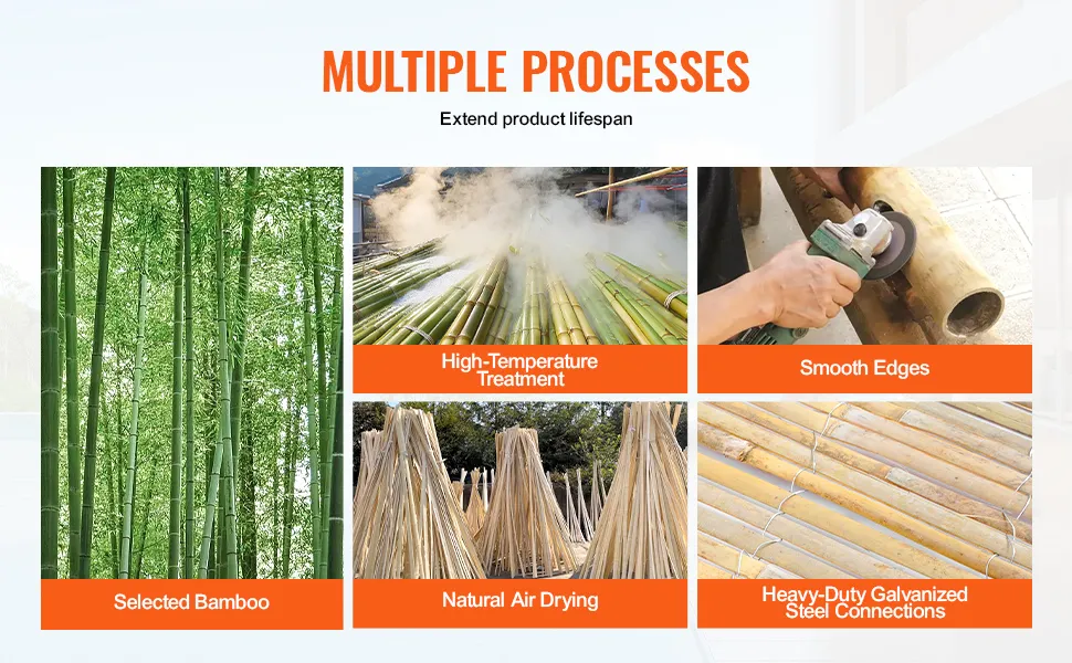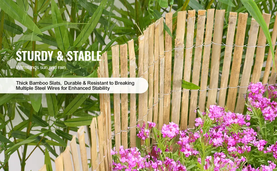 Izturīgs un stabils: katrs bambusa žoga elements nostiprināts ar izturīgu cinkota tērauda stiepli, kas nodrošina aizsardzību pret rūsu un kopējo izturību. Bambuss tiek apstrādāts ar karstuma metodi, lai uzlabotu ūdensizturību un paildzinātu kalpošanas laiku.