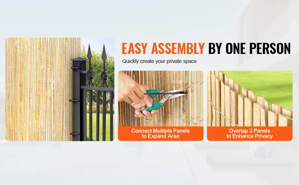 Vienkārša uzstādīšana: vienkārši atver iepakojumu un piestiprini 183 cm augsto bambusa sieta rulli pie margām vai stabiem ar piemērotiem stiprinājumiem (piem., savilcējiem vai stiepli). Viegli uzstādāms gan uz līdzenām, gan uz liektām virsmām, ietaupot laiku un pūles. Pirms uzstādīšanas ieteicams precīzi nomērīt vietu. Uz virsmas var būt nelieli skabargaini gali - ieteicams lietot cimdus.