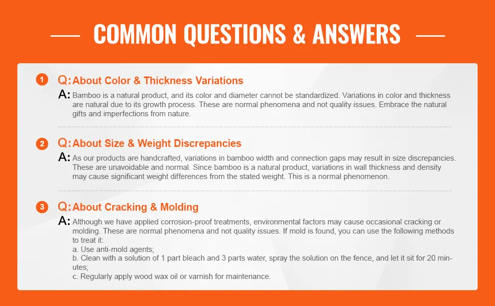 Padomi lietošanai: kā dabīgam produktam, katrs bambusa gabals ir unikāls, tāpēc krāsa un diametrs var nedaudz atšķirties. Lietojot ārā, regulāri ieteicams pārklāt ar lineļļļļu vai hermētiķi, lai saglabātu dabisko bambusa žoga izskatu.