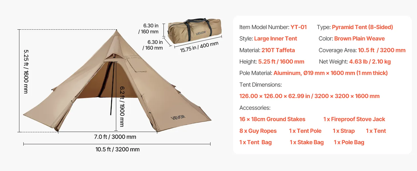 Plaša un ērta: Ar 3,2 m diametru un 1,6 m augstumu šī telts piedāvā pietiekami daudz vietas diviem pieaugušajiem vai vienai personai ar krāsni – ideāli piemērota gatavošanai, atpūtai vai darbam.
