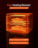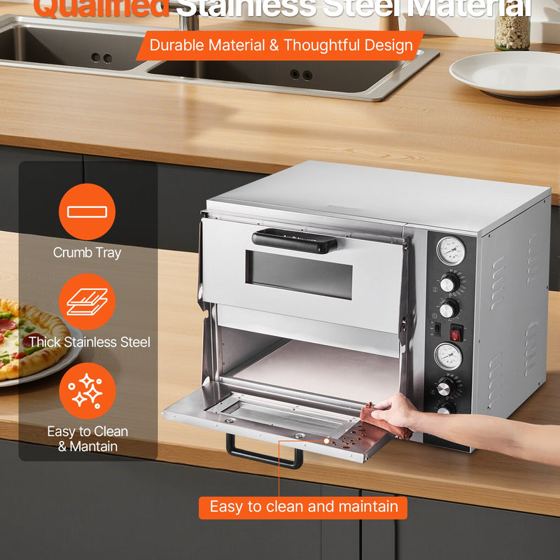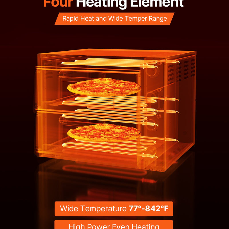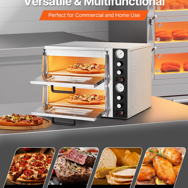 VEVOR 46 cm komerciālā elektriskā picas krāsns ir aprīkota ar augšējo un apakšējo nodalījumu, katram ar savu taimeri, temperatūras regulēšanas pogu un iebūvētu termometru. Lielā ietilpība ļauj izcept 4 × 23 cm picas vai 2 × 46 cm picas vienlaikus - katru līdz pilnībai.