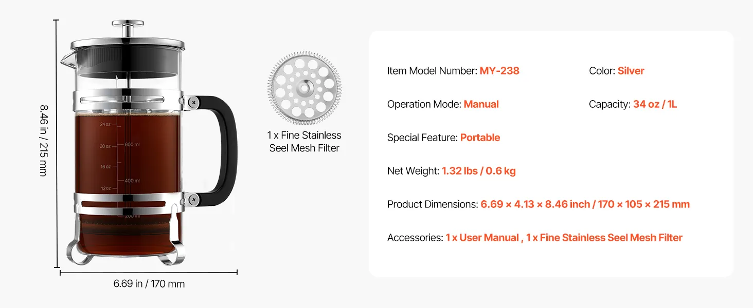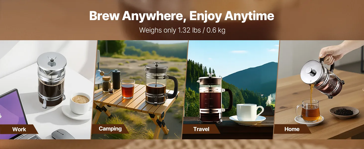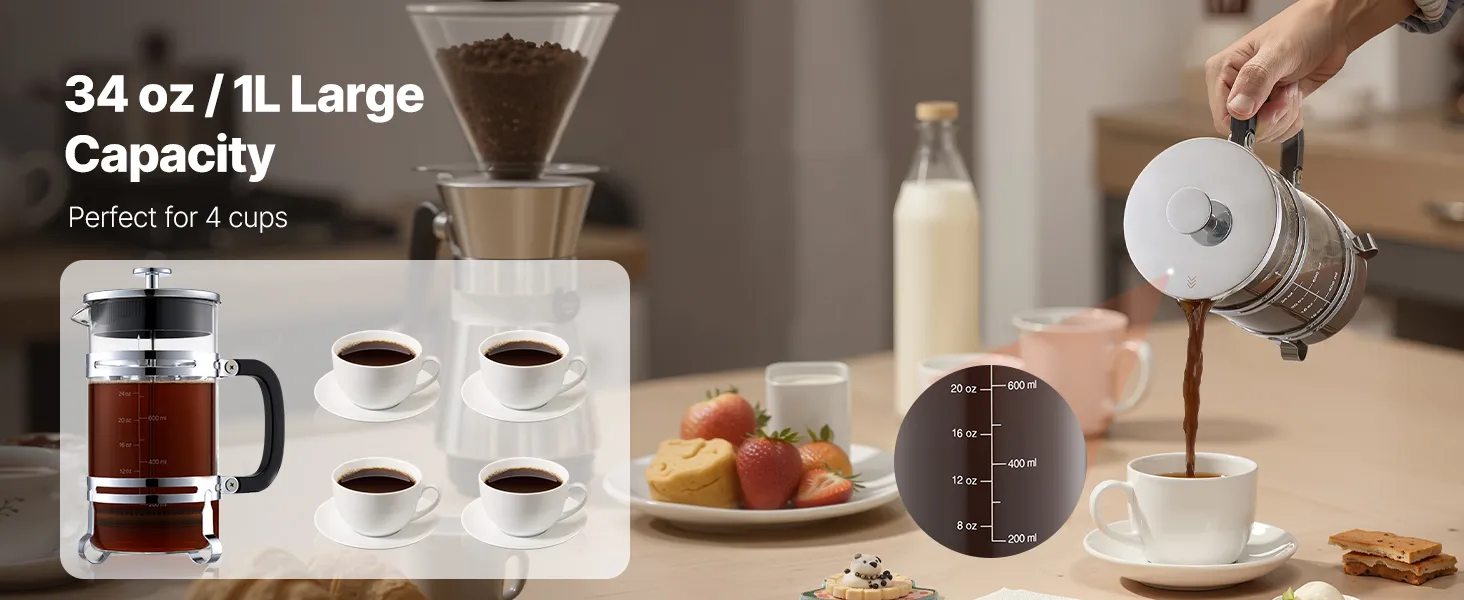Daudzpusīgs un pārnēsājams dizains: vairāk nekā tikai kafijai - ar šo 1 l sudraba franču presi var pagatavot arī tēju, auksto kafiju vai putot pienu. Kompakta, bet ietilpīga, ideāli piemērota mājām, birojam, kempingam vai lietošanai kopā ar draugiem un ģimeni.