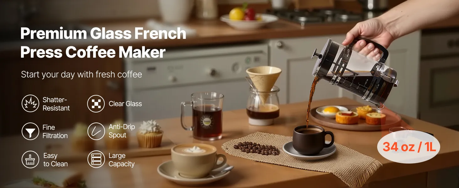 Vienkārša pagatavošana: šī stikla franču prese ar vienkāršu nospiešanas mehānismu ļauj pagatavot bagātīgu kafiju dažu minūšu laikā. Caurspīdīgie iedaļu marķējumi nodrošina precīzu devas kontroli, bet ergonomiskais, neslīdošais rokturis sniedz ērtu un stabilu lietošanu.