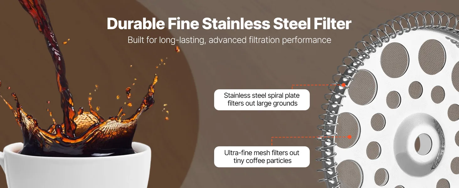 Precīza filtrācijas sistēma: mūsu kafijas prese aprīkota ar smalku filtrācijas sistēmu ar 304 nerūsējošā tērauda spirālplati, sietiņu un krusta plati. Tā efektīvi atdala biezumus, nodrošinot tīru un maigu garšu.
