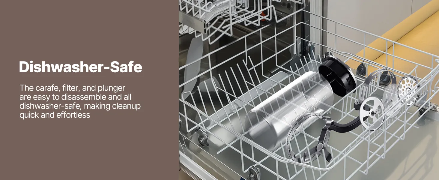 Viegla tīrīšana: franču kafijas prese ar gludu stikla virsmu, izņemamu filtru un spiedstieni nodrošina ērtu tīrīšanu. Visas detaļas viegli izjaucamas un piemērotas mazgāšanai trauku mazgājamajā mašīnā.