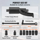 VEVOR torque multiplier in use on a truck wheel, with various socket sizes and versatile applications shown.