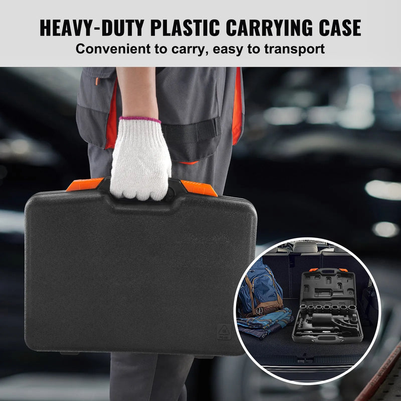 worker holding a black portable carrying case for the VEVOR torque multiplier with included sockets.