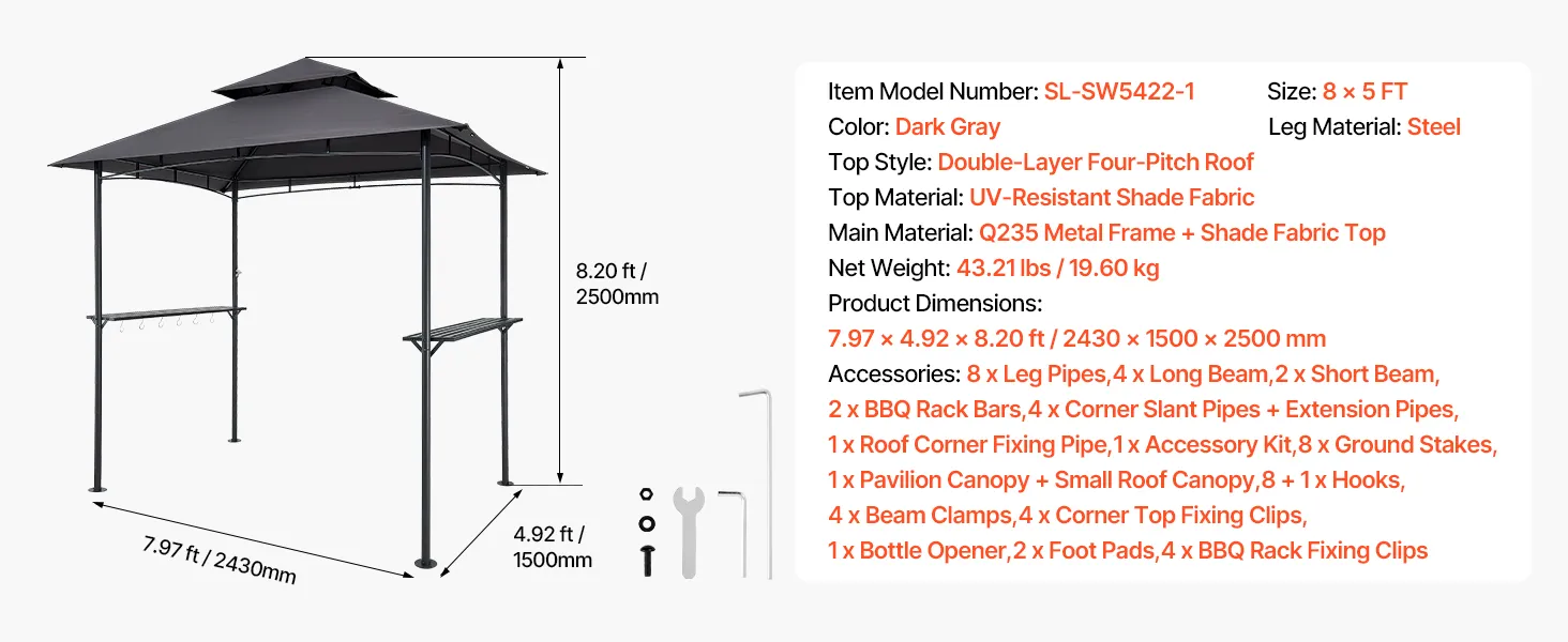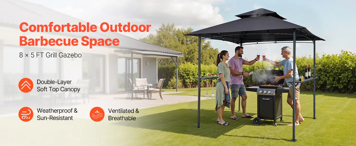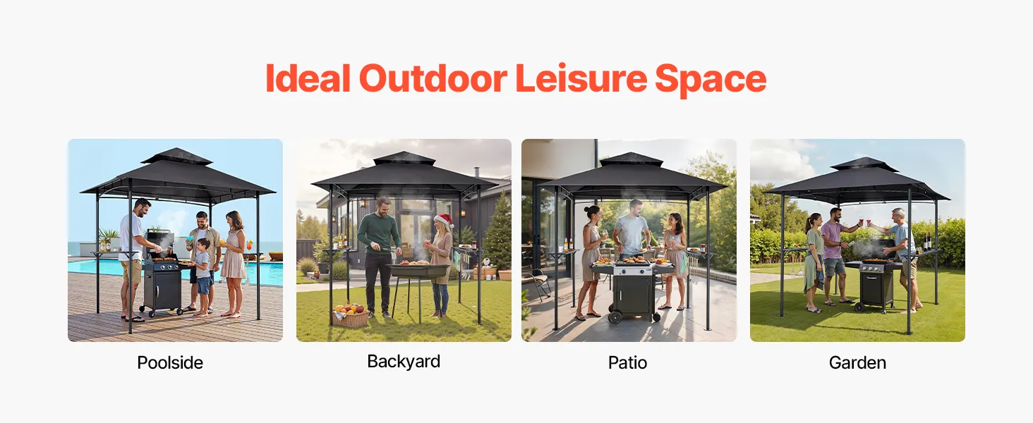 Plaša vieta grilēšanai: Grila nojume ar izmēriem 2,43 × 1,5 m nodrošina pietiekami daudz vietas 2–4 cilvēkiem, lai grilētu, sarunātos un baudītu kopā būšanu. Neatkarīgi no tā, vai gatavojat ēdienu, klājat galdu vai vienkārši atpūšaties, plašā konstrukcija nodrošina komfortu un brīvību kustībām. Ideāli piemērota āra kopā sanākšanai.