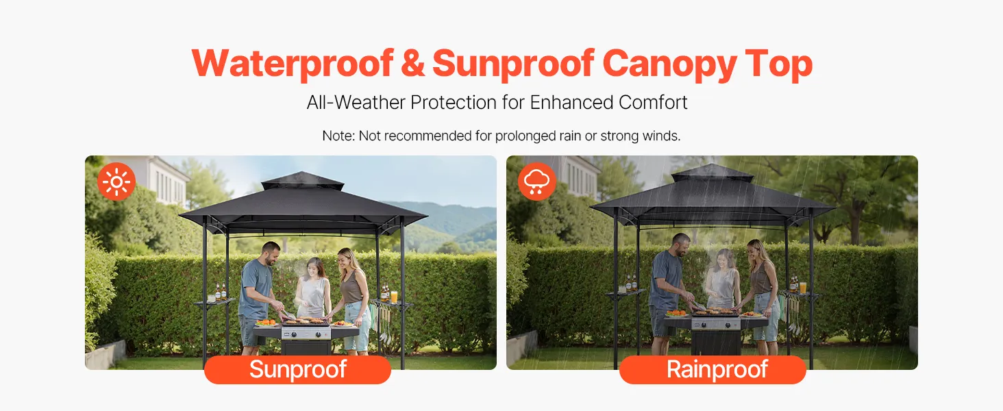 Piemērota jebkuriem laikapstākļiem: No terases un dārza līdz baseina zonai – šī BBQ nojume ir ideāla izvēle āra pasākumiem. Neatkarīgi no tā, vai rīkojat nedēļas nogales grilēšanu, ģimenes pikniku vai svinības, tā nodrošina aizsardzību gan lietū, gan saulē.