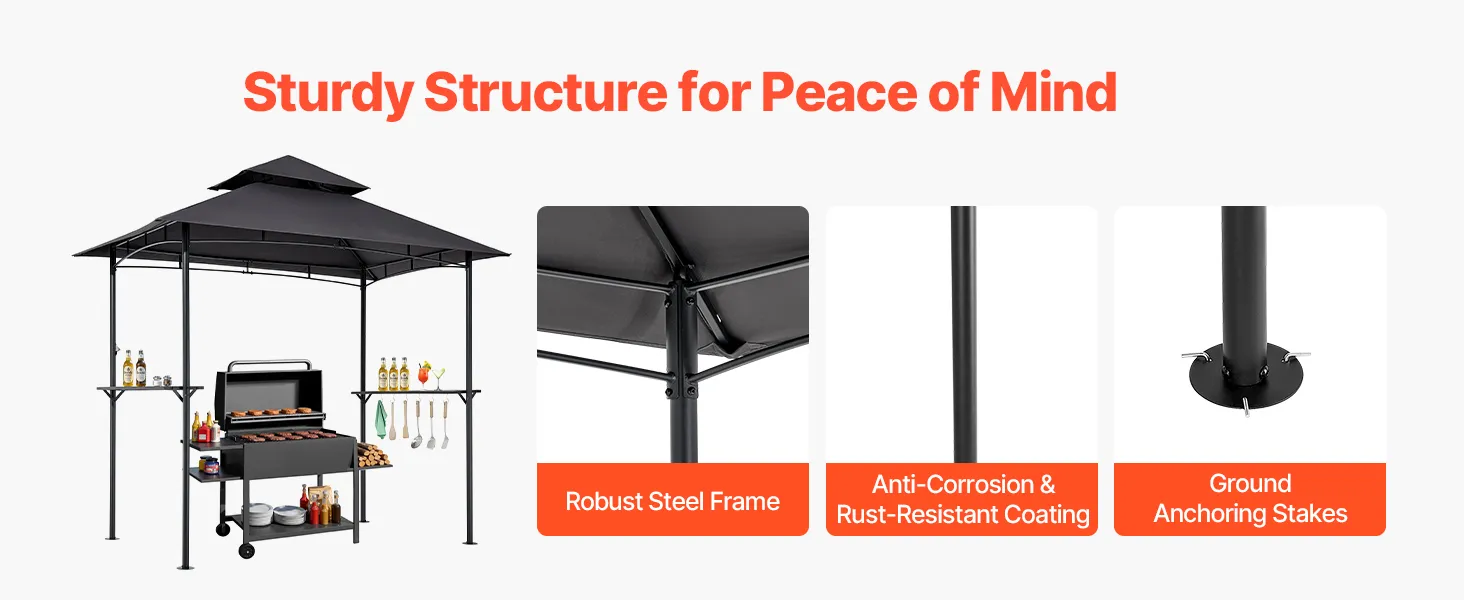 Izturīga un ilgmūžīga konstrukcija: Izgatavota no izturīga, pulverkrāsota Q235 tērauda, kas nodrošina aizsardzību pret rūsu, deformāciju un laikapstākļu ietekmi. Kopā ar stiprinājuma plāksnēm un mietiņiem šī BBQ nojume saglabā stabilitāti arī vējainos apstākļos, nodrošinot uzticamību katrā pasākumā.