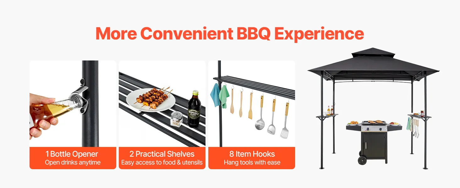 Pārdomāts dizains: Nojume ir aprīkota ar diviem sānu plauktiem ērtai garšvielu un trauku novietošanai, kā arī 8 āķiem grila piederumiem. Iebūvēts pudeļu attaisāmais ļauj viegli atvērt dzērienus, padarot grila staciju pilnībā aprīkotu no sagatavošanas līdz svinībām.
