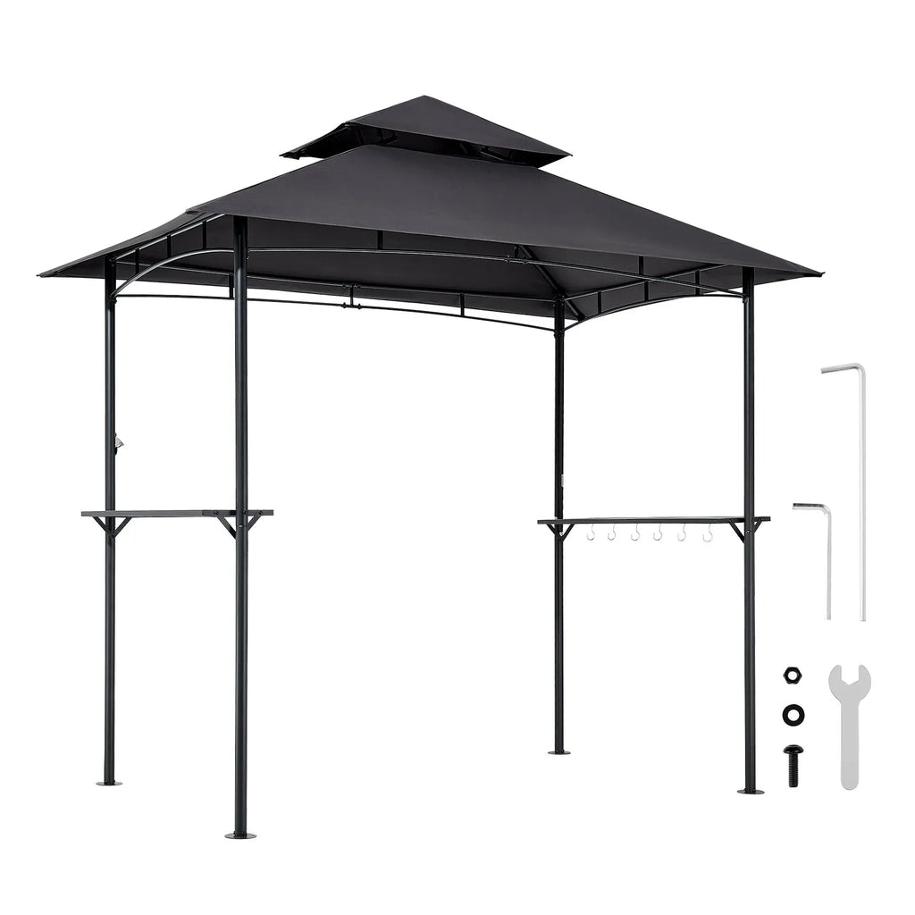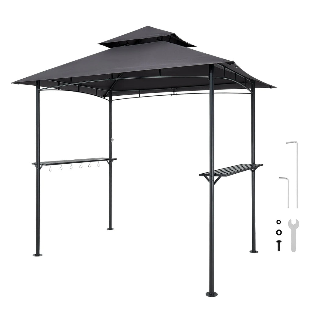 Grila nojume, 2,43 × 1,5 m āra BBQ nojume ar divslāņu jumtu, pulverkrāsota tērauda terases nojume ar 2 sānu plauktiem un 8 āķiem, grilēšanas nojume terasei, pagalmam, dārzam vai piknikam