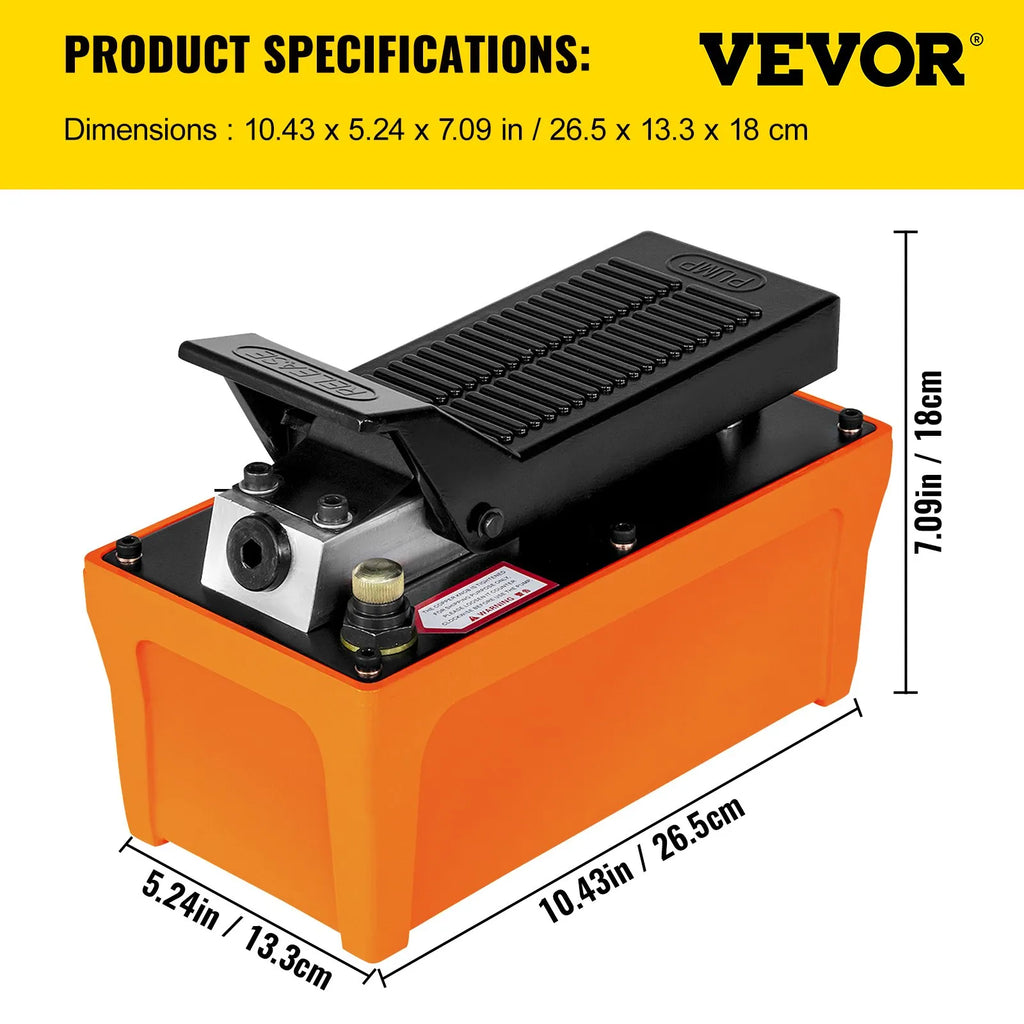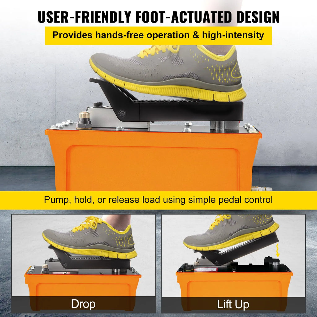 VEVOR pneimatiskais hidrauliskais sūknis ir aprīkots ar kājas pedāli, kas nodrošina ērtu un precīzu darbību. Šī brīvroku vadība ļauj koncentrēties uz uzdevumu, neatstājot nepieciešamību turēt sūkni ar rokām. Kājpedāļa mehānisms nodrošina vienmērīgu un precīzu hidrauliskā spiediena kontroli, padarot to īpaši noderīgu automobiļu remonta un rūpniecības darbos. Ergonomisks dizains padara lietošanu ērtu un paaugstina darba produktivitāti.