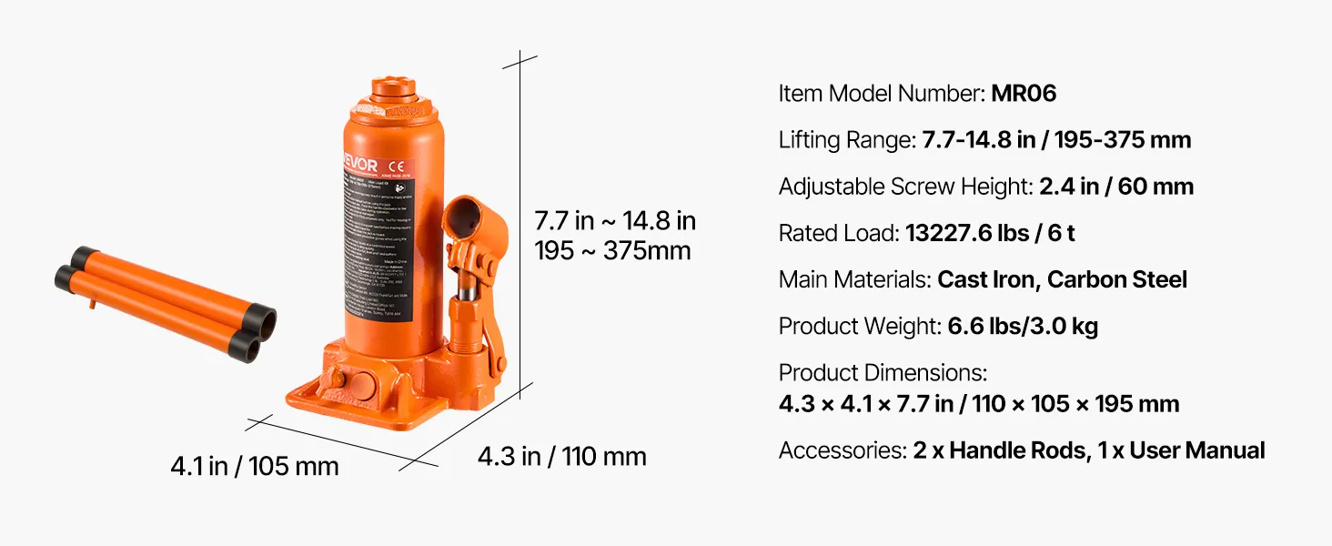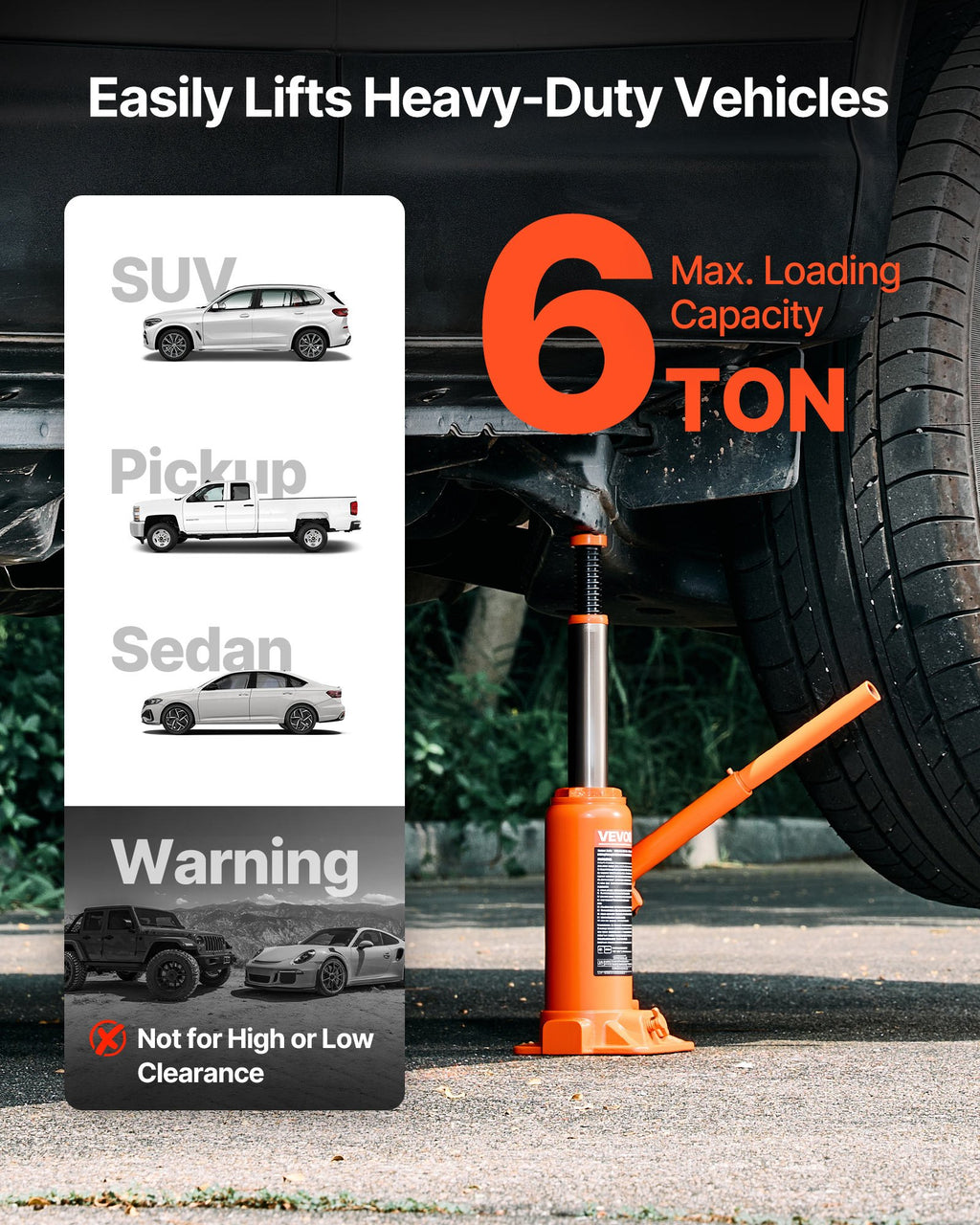 Mūsu hidrauliskais pudeļveida domkrats paceļ līdz 6 t, lieliski piemērots vieglajām automašīnām, pikapiem, SUV un miniveniem. Tas ir piemērots arī lauksaimniecības tehnikai un kompaktajām iekārtām. Drošai pacelšanai izvēlieties 6 t domkratu, ja jūsu transportlīdzekļa svars nepārsniedz 4 t.
