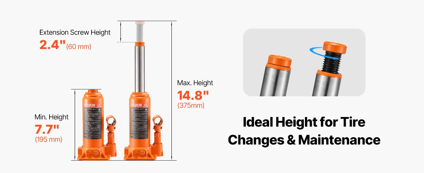No zemākā līdz augstākajam punktam - šim domkratam ir plašs pacelšanas diapazons. Tas paceļ no 195 mm līdz 375 mm, ar papildu 60 mm skrūvi augstuma precīzai regulēšanai, kas ir īpaši ērti šaurās vietās.