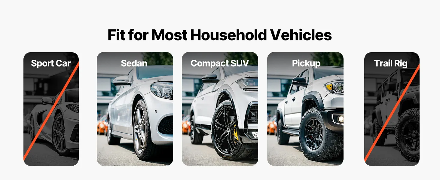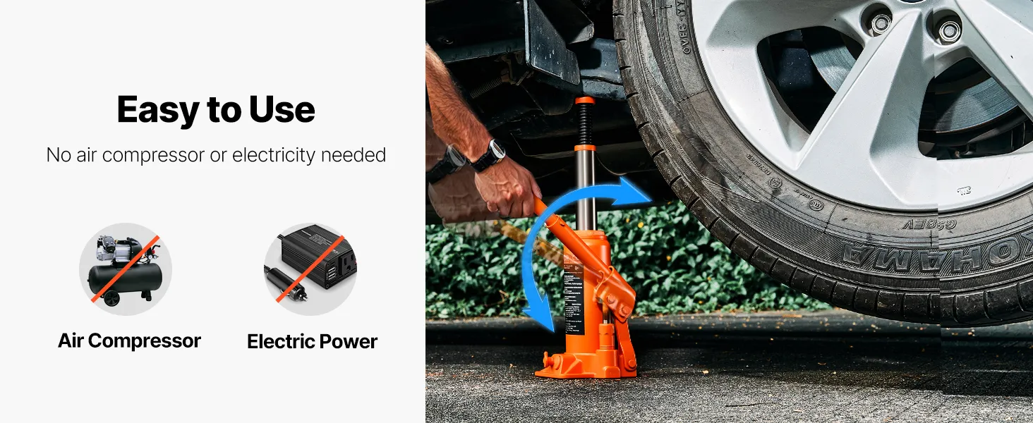 Kompakts un viegls smagās slodzes domkrats viegli ietilpst jūsu bagāžniekā vai garāžā. Gatavs darbam jebkurā laikā un vietā - nav nepieciešams kompresors vai elektrība.