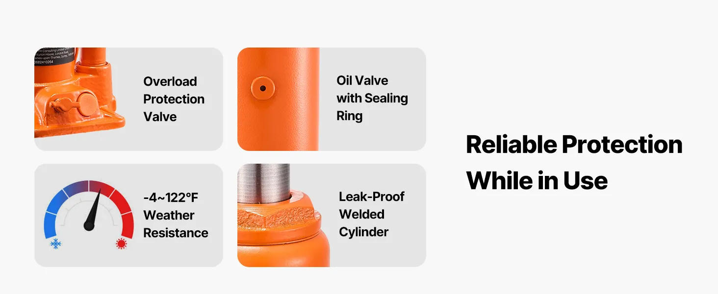 Mūsu augstais pudeļveida domkrats ir izgatavots no izturīgiem, augstas stiprības materiāliem, nodrošinot labāku hermētiskumu un slodzes noturību.