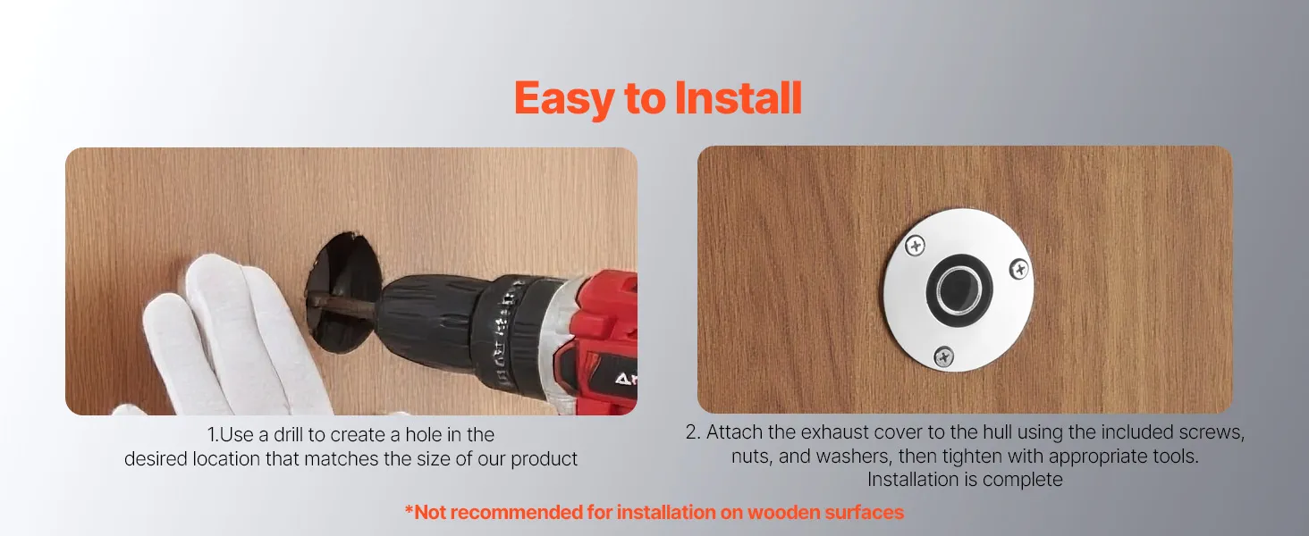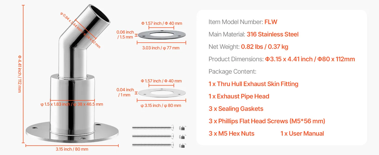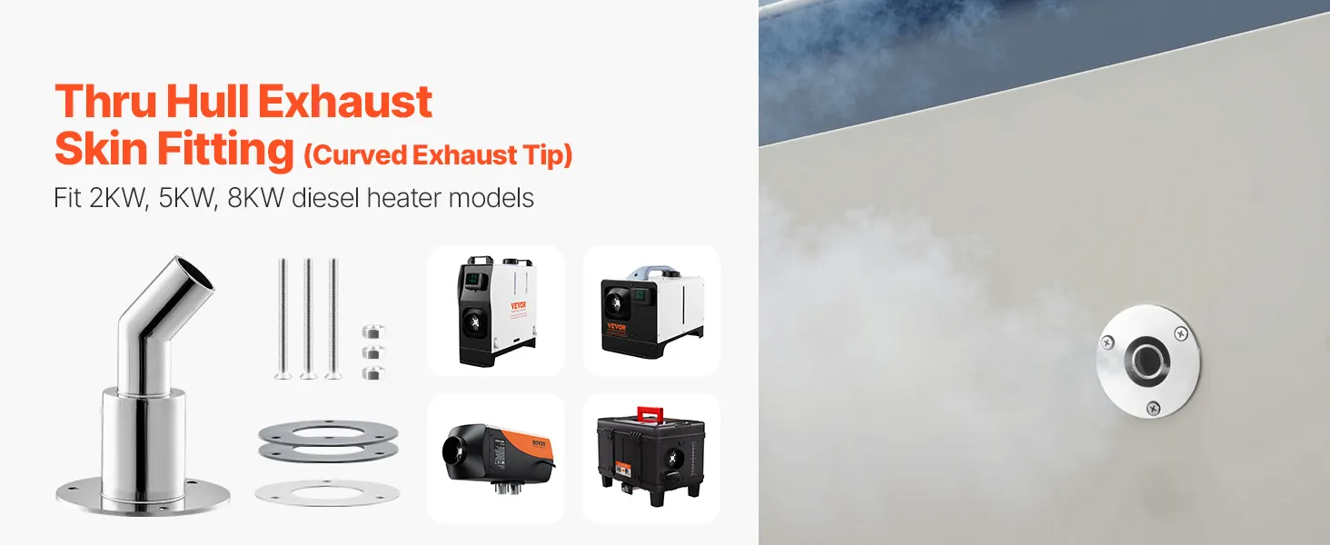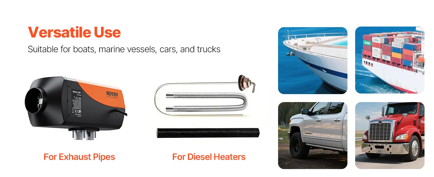 Augstas kvalitātes tērauda konstrukcija: Nerūsējošā tērauda izplūdes korpuss apvieno izturīgu konstrukciju ar lielisku karstuma un korozijas noturību. Tas nodrošina drošu izplūdes gāzu novadīšanu un ir ideāli piemērots jūras vai automobiļu dīzeļsildītāju uzstādīšanai.