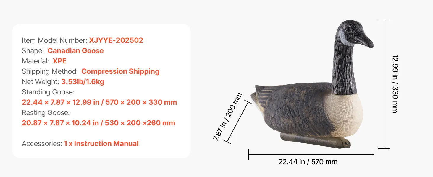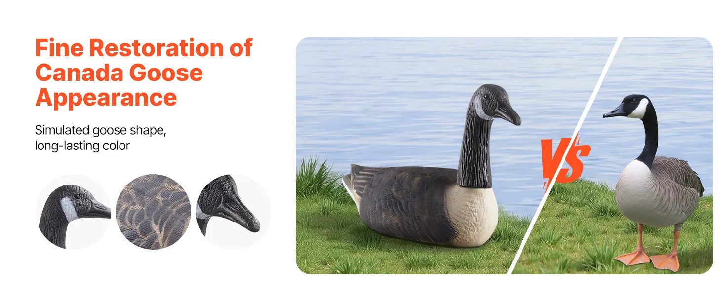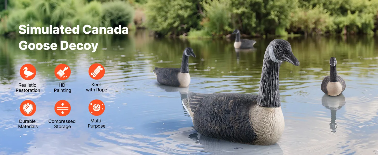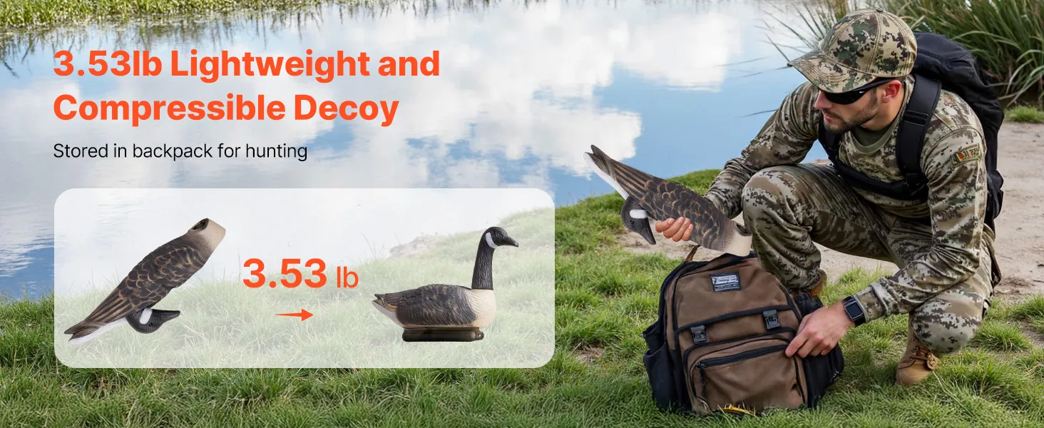 Izgatavoti no triecienizturīga XPE materiāla, šie Kanādas zosu mānekļi ir viegli, izturīgi un ilgnoturīgi. Visa komplekta svars ir tikai 1,6 kg, un mānekļus var saspiest, lai tie aizņemtu minimālu vietu uzglabāšanā vai transportēšanā.
