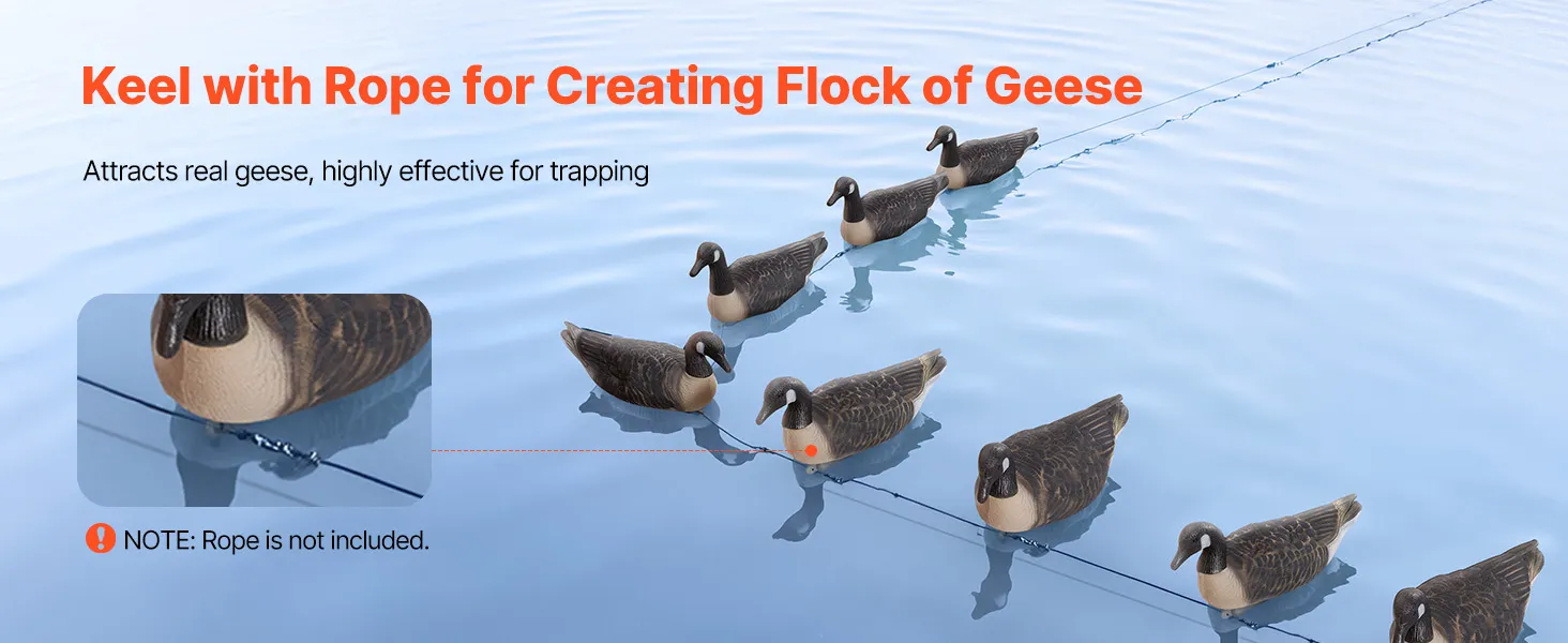 Speciālā ķīļa konstrukcija ļauj mānekļus viegli piestiprināt ar virvi, lai tie dabiski šūpotos vai peldētu līdz ar ūdens plūsmu vai vieglu vēju, atdarot zosu bara kustības dabiskā vidē.