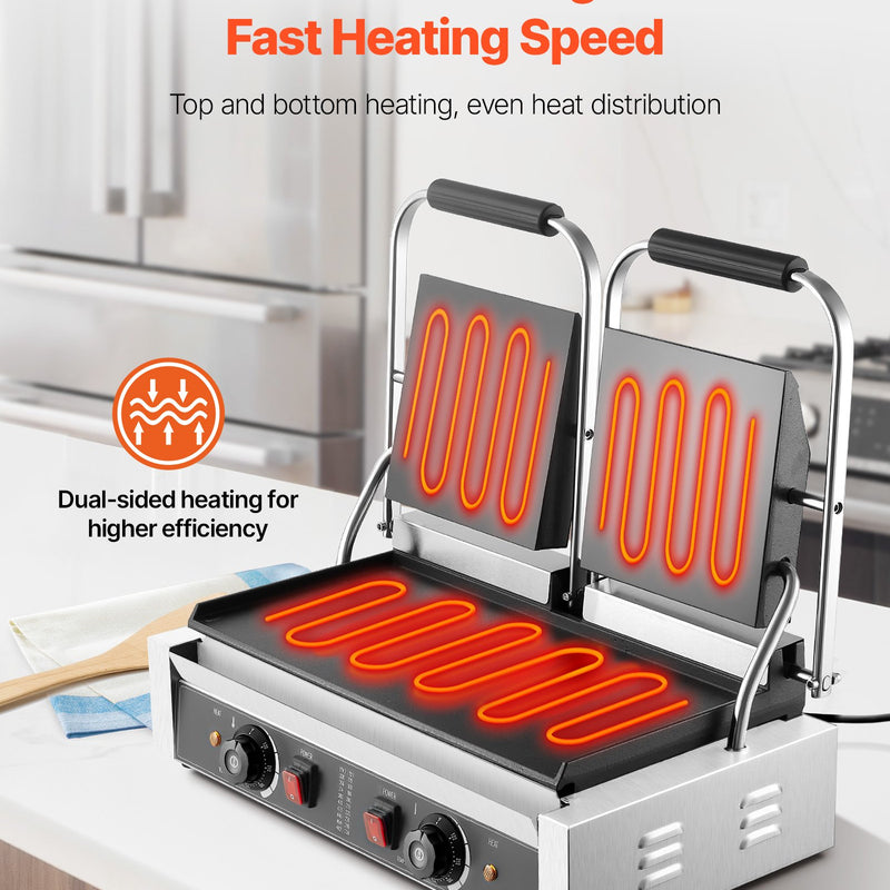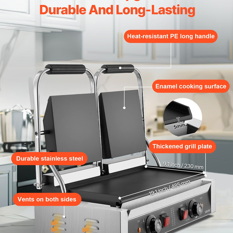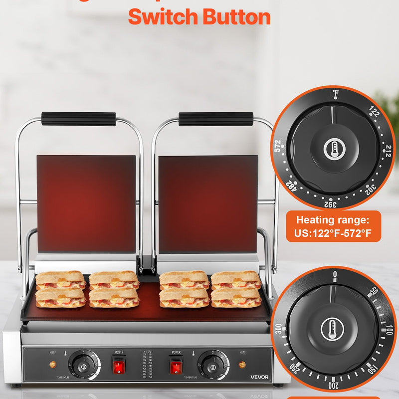 Daudzfunkcionāls grils: šī panini grilēšanas iekārta ļauj vienlaikus gatavot dažādus ēdienus, padarot to ideāli piemērotu dārzeņu, gaļas, siera, olu kultenes, panini sviestmaižu, burgeru, vistas, brokastu ēdienu, steiku un citu produktu pagatavošanai.