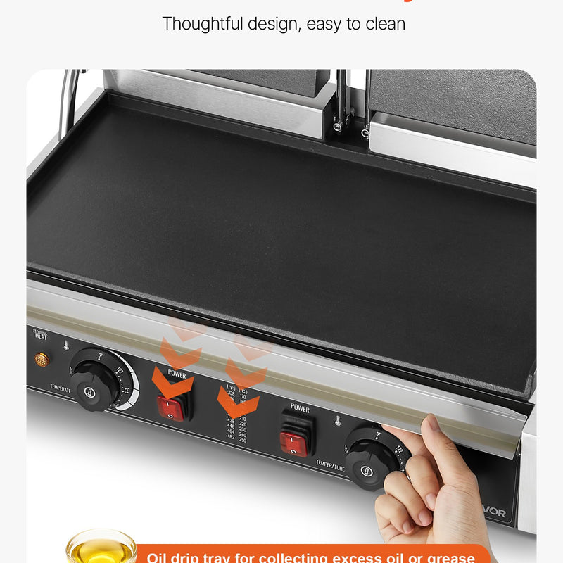 Viegla tīrīšana: panini grils ir aprīkots ar noņemamu eļļļas trauku, kas vienkāršo tauku un atkritumu savākšanu. Kopšanu atvieglo skrāpis un sausa drāna. Abās pusēs izvietotās ventilācijas atveres efektīvi izkliedē siltumu.